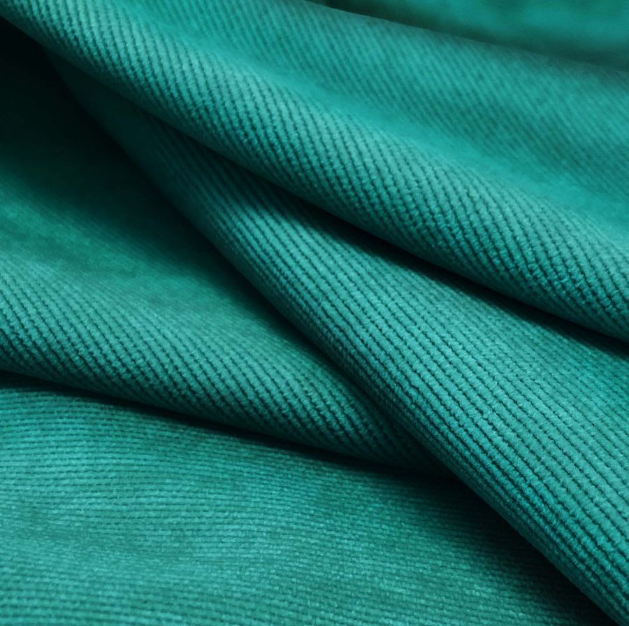 La tela base es la Pana Aterciopelada - Dublin, compuesta por 85% poliéster, 12% poliamida y 3% elastano, con un gramaje de 280 gr/m2 y un ancho de 150 cm. El color liso impreso es una mezcla de verde y verde azulado medio, con un CMYK de 85 30 50 17. Este color transmite una sensación de frescura y calma, combinando perfectamente con tonos tierra y beige en decoración y con gris oscuro en moda. Cabe destacar que la tela está impresa con el color liso a una sola cara por impresión digital textil, lo que permite la máxima definición y nitidez en el color.