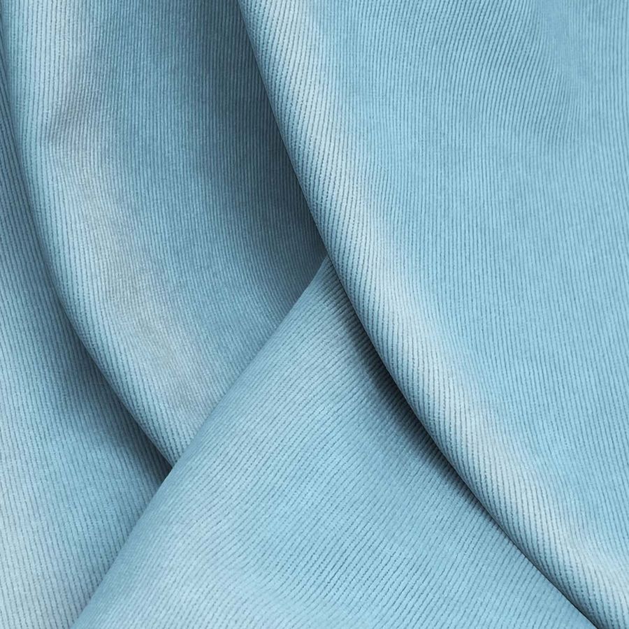 La tela base es la Pana Aterciopelada - Dublin, compuesta por un 85% de poliéster, 12% de poliamida y un 3% de elastano, con un gramaje de 280 gr/m2 y un ancho de 150 cm. El color liso impreso es un Azul Vaquero, con un CMYK de 51 11 8 0, lo que le da un aspecto visual brillante y una textura suave al tacto. Combina con colores como el blanco, negro, gris y beige.