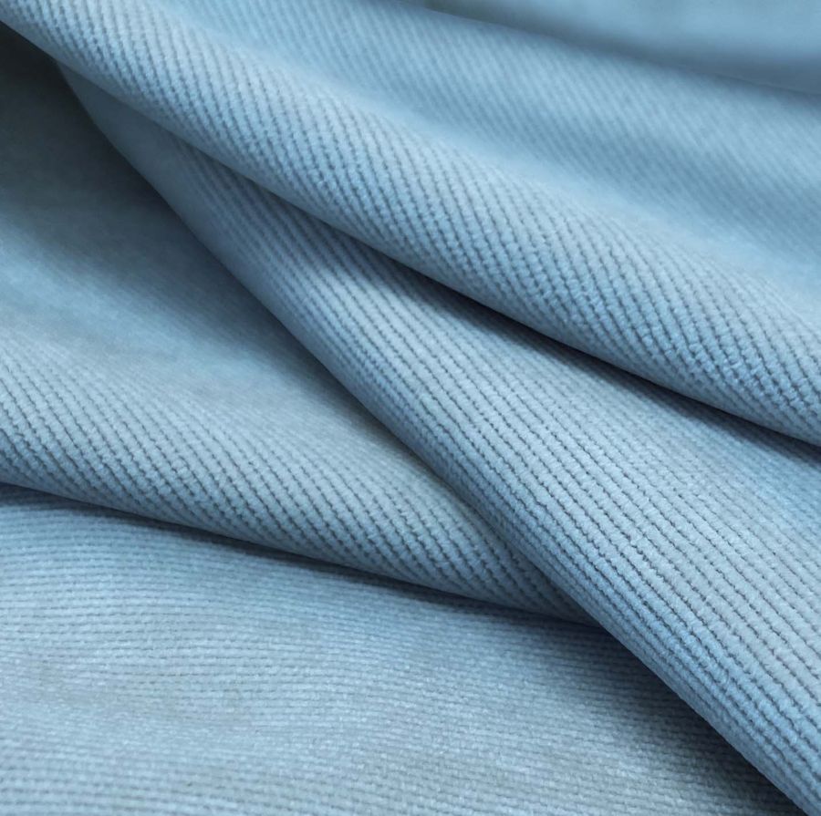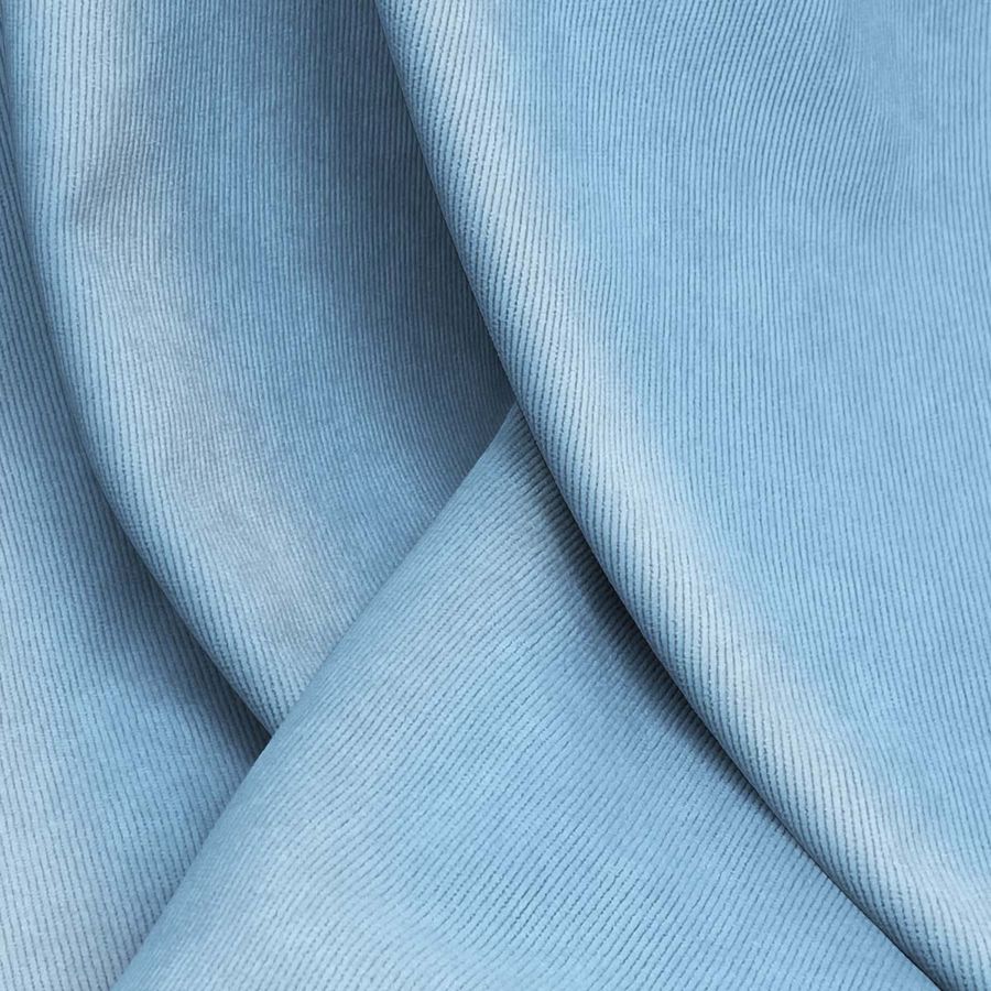 La tela base de la Pana Aterciopelada - Dublin es una pana compuesta principalmente por poliéster, poliamida y elastano, lo que le brinda una textura suave al tacto y visualmente brillante. El color liso impreso es un azul iceberg, reflejado en el CMYK 52 18 2 0. Este color secundario combina perfectamente con tonalidades neutras como el blanco y el gris, así como también con otros azules más oscuros y tonos verdes.