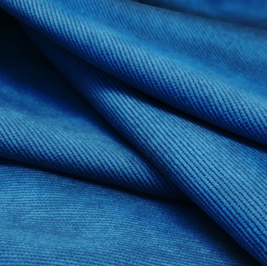 La tela base, Pana Aterciopelada-Dublin, es una pana compuesta de 85% POLIÉSTER, 12% POLIAMIDA y 3% ELASTANO. Su gramaje es de 280 gr/m2 y su ancho de 150 cm. El color liso impreso que se ha añadido al tejido es Azul Arándano, con un CMYK de 98 71 11 1. Este color es símbolo de frescura, juventud y armonía. Se combina muy bien con tonalidades de marrones, verdes y grises. El tejido está impreso a una sola cara por impresión digital textil.