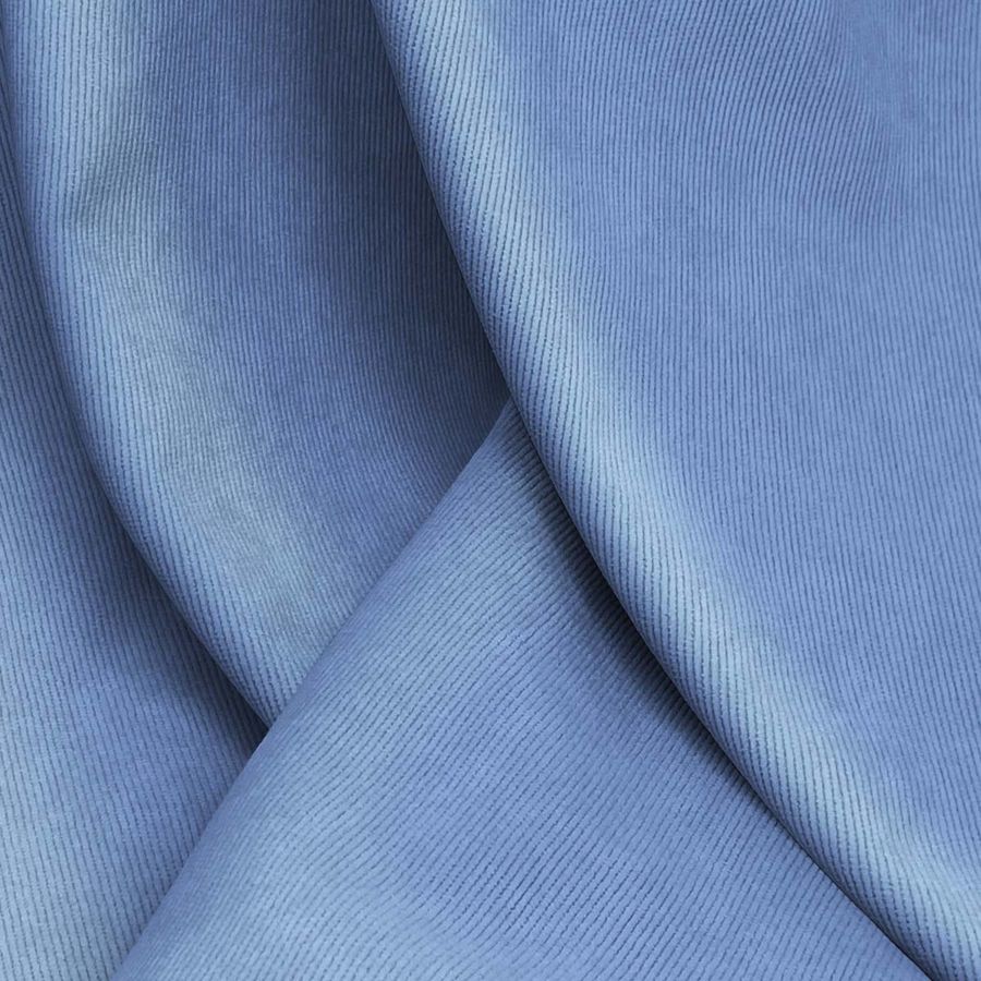 La tela base de este tejido es la Pana Aterciopelada - Dublin, compuesta por 85% de poliéster, 12% de poliamida y 3% de elastano, con un gramaje de 280 gr/m2 y un ancho de 150 cm. El color liso impreso es Azul-Azul celeste, con un contenido de tinta Cyan del 65%, Magenta del 45%, Yellow del 5% y Black del 0%, lo que arroja un CMYK de 65 45 5 0. Este color transmite calma y frescura, y se combina especialmente bien con tonos grises y blancos.