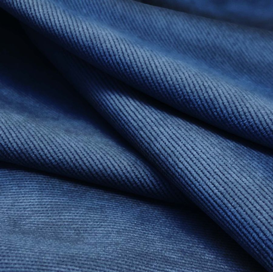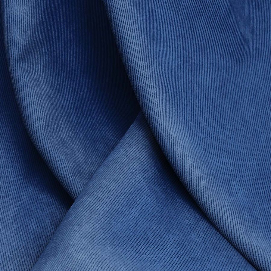 La tela base de este tejido es Pana Aterciopelada - Dublin, compuesta por un 85% de poliéster, 12% de poliamida y un 3% de elastano con un gramaje de 280 gr/m2 y una anchura de 150 cm. El color liso impreso es un tono azul tráfico con un CMYK de 100 82 31 14. Este tono secundario encaja perfectamente con otros tonos azules, grises y blancos, creando un estilo vanguardista y moderno. Es importante señalar que la tela está impresa con el color liso a una sola cara por impresión digital textil, lo que implica que no se trata de un tejido tintado por completo, sino impreso en una sola cara.