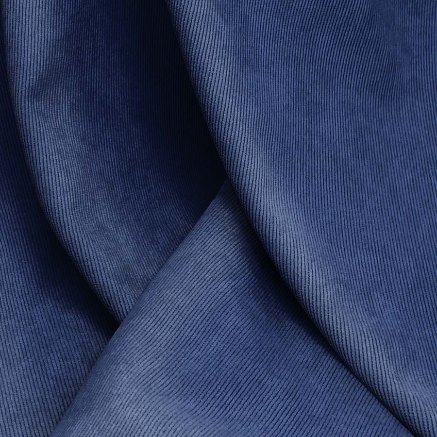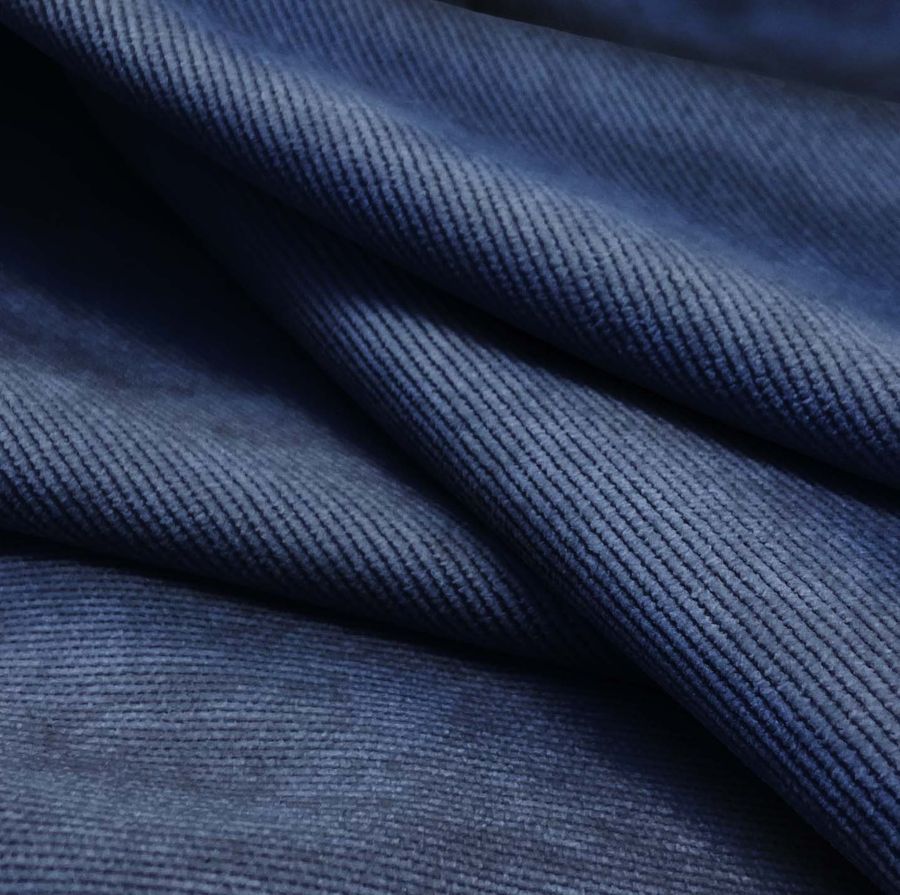 La tela base de este tejido es la Pana Aterciopelada - Dublin, compuesta por un 85% de poliéster, 12% de poliamida y un 3% de elastano. Posee un gramaje de 280 gr/m2 y una longitud de tela de 150 cm. El color liso impreso es de un azul pizarra oscuro, que se logra a través de la técnica de sublimación, con tinta en un 100% de cian, 86% de magenta, 38% de amarillo y 31% de negro. Este color secundario se caracteriza por ser intenso y profundo, con una tonalidad elegante y sobria. Combina muy bien con colores sólidos como el dorado, plateado, blanco y gris.