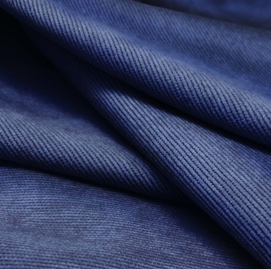 La tela base de esta prenda es la Pana Aterciopelada Dublin, compuesta por 85% poliéster, 12% poliamida y 3% elastano. Esta tela tiene un gramaje de 280 gr/m2 y un ancho de 150 cm. El color liso impreso es Azul/Noche Azul, con un CMYK de 100 89 32 16. Se combina perfectamente con tonos ocres, marrones y verdes.