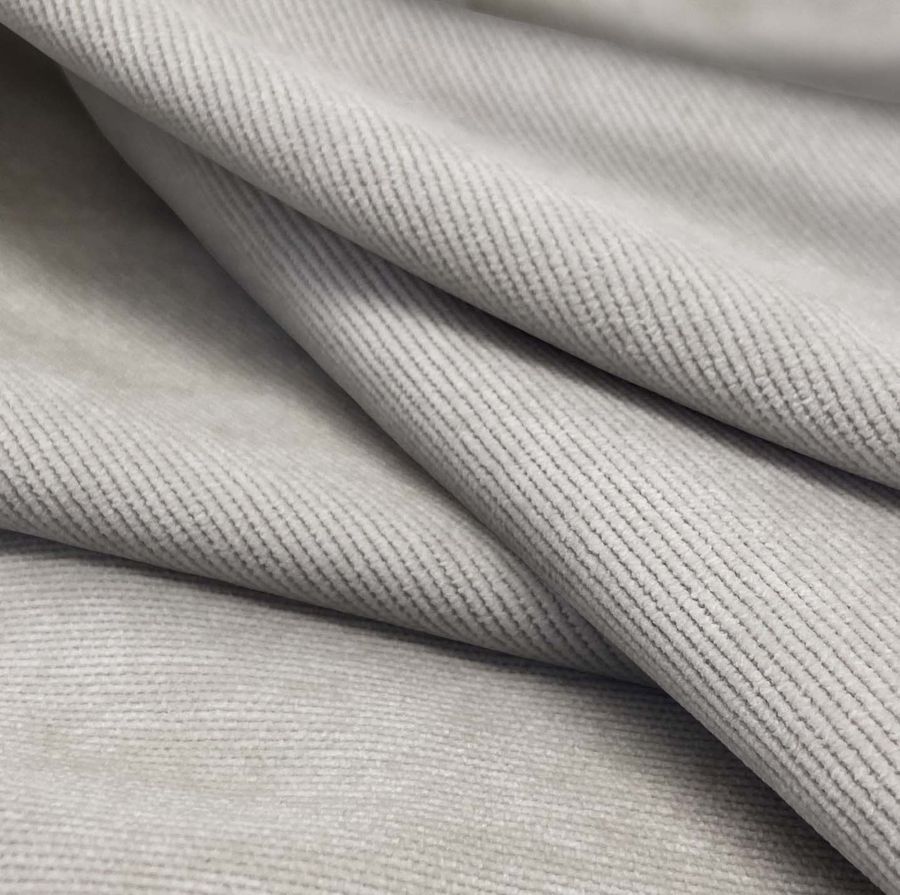 La tela base de este tejido es la Pana Aterciopelada - Dublin, compuesta por un 85% de poliéster, un 12% de poliamida y un 3% de elastano, con un gramaje de 280 gr/m2 y un ancho de 150 cm. El color liso impreso es un Nube Gris con un CMYK 25 21 21 2. Este color presenta una sensación reconfortante y neutra, sugiriendo una imagen de tranquilidad y estabilidad. Este gris combina muy bien con otros matices fríos como el blanco, el azul o el verde. Es importante destacar que el tejido está impreso con el color liso a una sola cara por impresión digital textil.