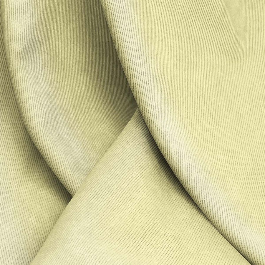 La tela base de este producto es una pana aterciopelada llamada Dublin, compuesta por 85% de poliéster, 12% de poliamida y un 3% de elastano. El color liso impreso es un amarillo con tonos maíz, cuyas cuatro tintas CMYK son 4 de cian, 0 de magenta, 47 de amarillo y 0 de negro. Este color es suave y brillante, lo que proporciona una sensación cálida y acogedora. Combina perfectamente con otra paleta de colores como el verde oliva, marrón oscuro, blanco y gris.