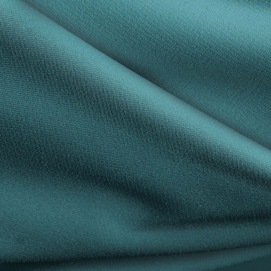 La tela base es Punto Sintético con Spandex - Support, compuesta de 95% poliéster y 5% elastano, con un gramaje de 237 gr/m2 y ancho de 152 cm. El color liso impreso, en tonalidad azul-verde azulado medio, se obtiene mediante la tecnología de sublimación con un CMYK de 80 40 47 29. La tonalidad se caracteriza por ser fresca y vibrante, con una presencia predominante de azul y pequeñas pinceladas de verde. Combina muy bien con tonalidades neutras, como el blanco o el negro, y colores análogos como el turquesa o el verde oliva.