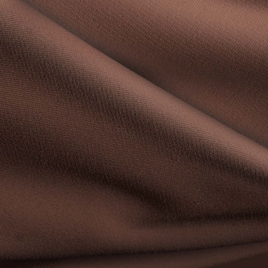 La tela base del tejido en cuestión es el Punto Sintético con Spandex - Support, con una composición de 95% poliéster y 5% elastano y un gramaje de 237 gr/m2. El color liso impreso en la tela es de un tono marrón oscuro llamado Noche de Sangre, con un contenido de CMYK de 43% de cian, 69% de magenta, 70% de amarillo y 64% de negro. Este color oscuro se puede combinar con colores neutros como el blanco, gris y tonalidades de marrón o bien con tonos más vibrantes como el rosa fuerte, dorado o plateado.