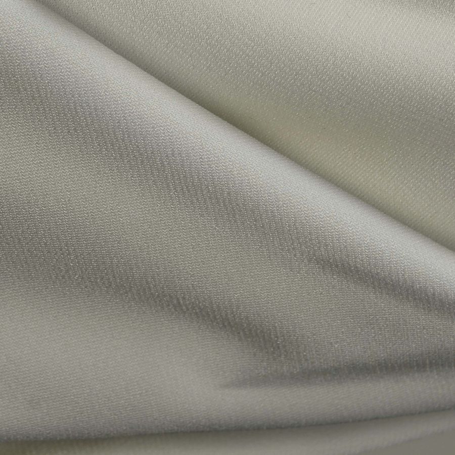 Esta tela base, llamada Punto Sintético con Spandex - Support, es un tejido de punto compuesto por 95% poliéster y 5% elastano, con un gramaje de 237 gr/m2 y un ancho de 152 cm. El color liso impreso es Crudo/Ceniza Blanca, con un CMYK de 16 9 23 0. Este color se presenta con una textura visual opaca y un tacto suave y elástico. Combina notablemente con tonos pasteles y neutros, como el rosa y el gris claro.
