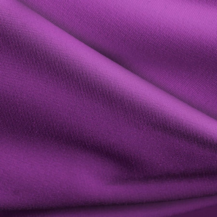 La tela base de esta prenda es el Punto Sintético con Spandex - Support, compuesta por 95% de poliéster y 5% de elastano, con un gramaje de 237 gr/m2 y un ancho de 152 cm. Está impresa con un color liso Morado/Púrpura, cuyos atributos de color reflejan un CMYK de 65 98 9 2, con una predominancia de la tinta magenta, lo que le brinda un tono oscuro y profundo. Este color combina perfectamente con tonos blancos, grises, negros y otros tonos más claros de la misma gama de color.
