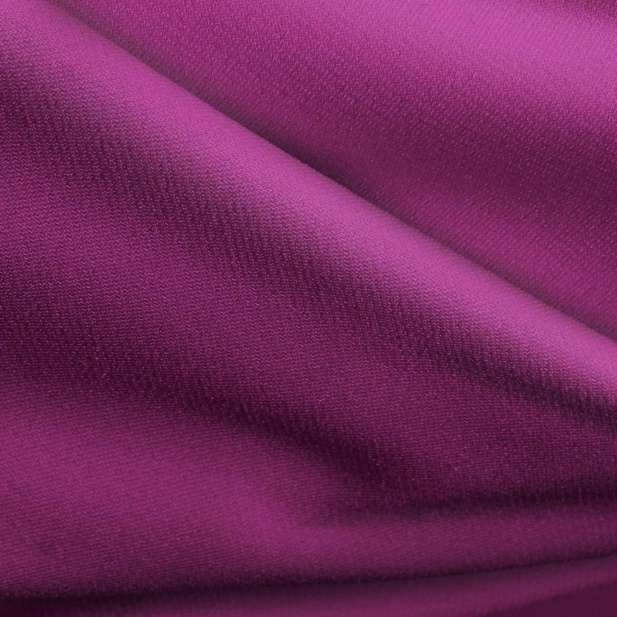 La tela base, Punto Sintético con Spandex - Support, es una tela de punto compuesta principalmente de poliéster y elastano, con un gramaje de 237 gr/m2 y un ancho de 152 cm. El color liso impreso en esta tela es un Morado Berenjena, con una composición de tintas compuesta por Cyan 53, Magenta 99, Yellow 25 y Black 18, lo que da como resultado un equilibrio entre tonalidades frías y cálidas. El color secundario que predomina es el magenta, con una intensidad que lo hace destacar por encima de los otros colores de la combinación. Este color se combina perfectamente con colores complementarios como el verde o el amarillo, pero también puede combinarse con tonalidades más oscuras como el negro o el gris.