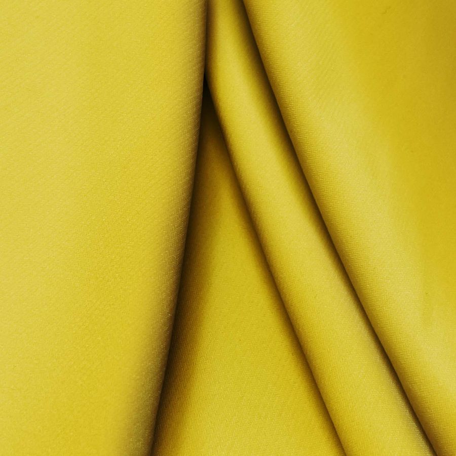 La tela base, Punto Sintético con Spandex - Support, tiene una composición de 95% poliéster y 5% elastano, con un gramaje de 237 gr/m2 y un ancho de 152 cm. El color liso impreso es amarillo-marrón galleta, con un CMYK de 20 29 98 7. Este tono cálido y terroso se combina bien con tonos neutros como beige o blanco, así como con tonos más atrevidos como rosa o verde oscuro. Cabe destacar que la tela está impresa con el color liso en una sola cara por impresión digital textil, lo que significa que la tinta se infunde en la fibra del tejido en lugar de simplemente quedarse sobre la superficie.