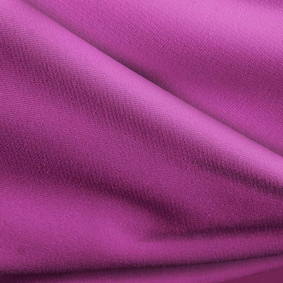 La tela base es el Punto Sintético con Spandex - Support, con un gramaje de 237 gr/m2, compuesta de un 95% de poliéster y un 5% de elastano, con un ancho de 152 cm. El color impreso es un Morado-Ciruela Rosa con un CMYK de 38, 87, 2, 0, que aporta una textura visual opaca, suave al tacto y elástica. Es un color que combina bien con tonos neutros, como grises o cremas, así como con azules y verdes más intensos.