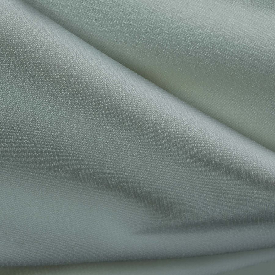 La tela base es Punto Sintético con Spandex - Support, compuesta por un 95% de poliéster y un 5% de elastano, lo que le proporciona una textura suave, elástica y cómoda al tacto. Su gramaje es de 237 gr/m2 y tiene una anchura de 152 cm. El color liso es impreso mediante la tecnología de sublimación, con un CMYK de 35 10 26 0, en un tono verde-azul verdoso.
