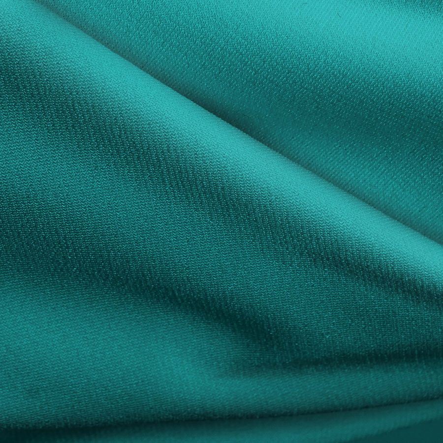 La tela base es el Punto Sintético con Spandex - Support, compuesta por un 95% de poliéster y un 5% de elastano, con un gramaje de 237 gr/m2 y un ancho de 152 cm. El color liso impreso es un verde azulado medio, con un CMYK de 85 30 50 17. Este color ofrece una sensación de frescura y tranquilidad, simbolizando la naturaleza y el mar. El verde azulado medio combina muy bien con blancos, naranjas, amarillos y rojos, creando combinaciones refrescantes y vitales.
