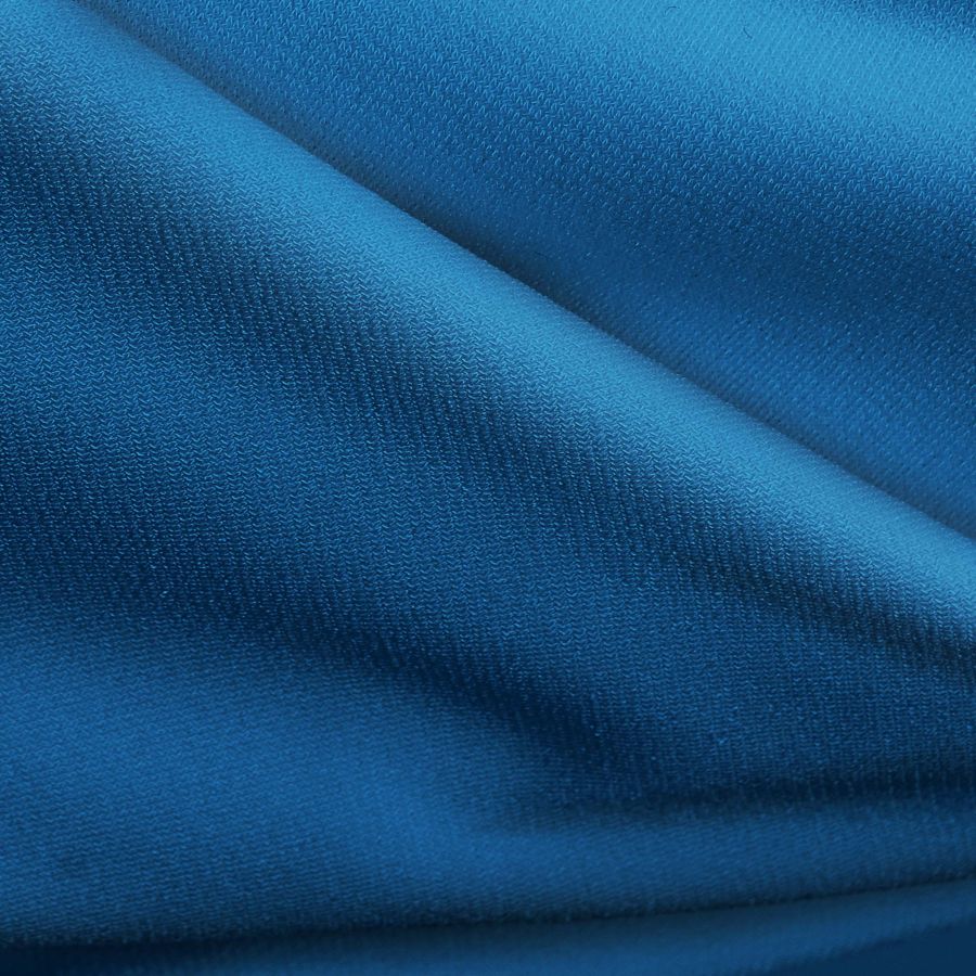 La tela base de esta prenda es Punto Sintético con Spandex - Support, compuesta por 95% POLIÉSTER y 5% ELASTANO, con un gramaje de 237 gr/m2 y un ancho de 152 cm. En cuanto al color liso impreso, se trata de un Azul Arrendajo con un contenido de tinta Cyan de 96, Magenta de 64, Yellow de 22 y Black de 6, lo que nos da un CMYK de 96 64 22 6. Este color es profundo y vibrante, lo que transmite una sensación de confianza y seguridad. Combina perfectamente con tonos grises y blancos, así como con otros azules más apagados y verdes.