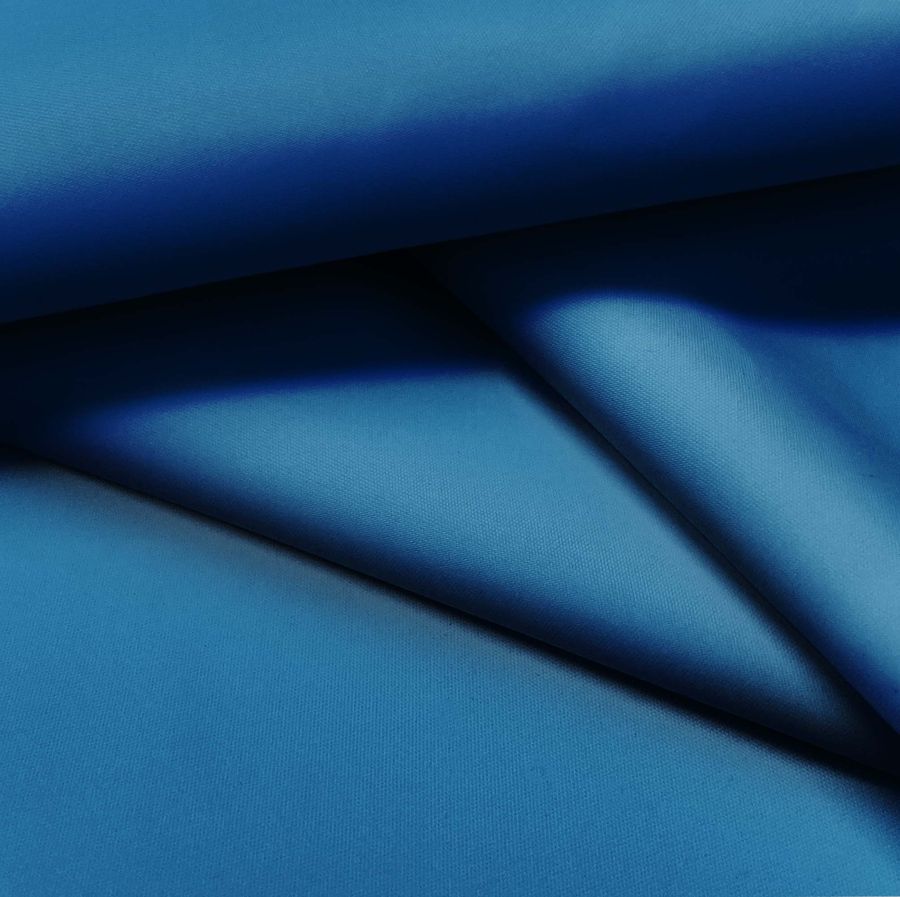 La tela base, Tela fina repelente al Agua - Storm, tiene una composición de 100% poliéster, un gramaje de 70 gr/m2 y un ancho de 145 cm. Su color liso impreso presenta un tono azul zafiro, con un CMYK de 98 67 20 5. Este color secundario simboliza la sabiduría, la verdad y la confianza, y se combina particularmente bien con tonos grises, blancos y plateados. Cabe mencionar que el tejido está impreso con el color liso a una sola cara por impresión digital textil, siendo importante considerar que no es un tejido tintado sino impreso por una sola cara.