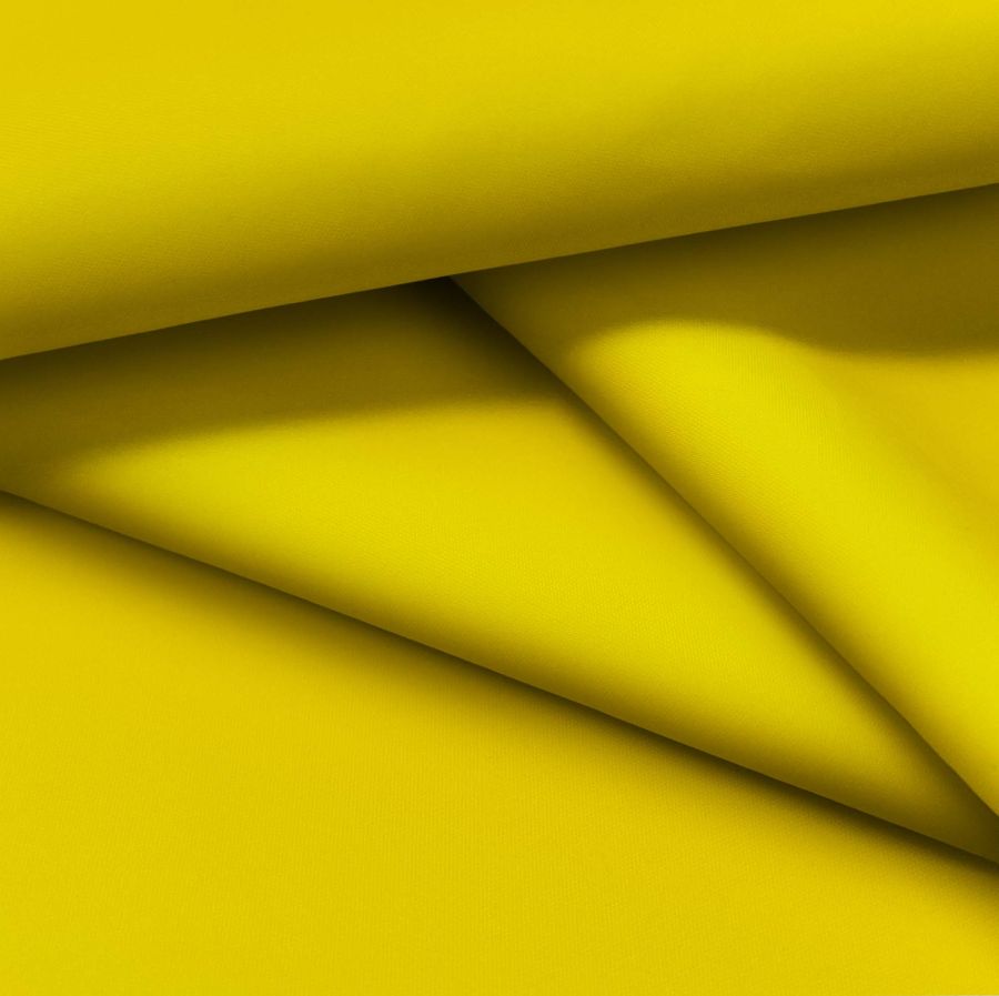 La tela base es una tela fina repelente al agua, conocida como Storm, de tejido técnico y composición 100% poliéster, con un gramaje de 70 gr/m2 y un ancho de 145 cm. El color liso impreso es de un amarillo profundo según los datos del CMYK 9 23 96 1. Este color representa un color cálido y vibrante, que transmite fuerza, dinamismo y energía. Se asocia con el sol, la luz y la creatividad, y puede combinarse con otros colores como el negro, el blanco, el gris, el azul marino o el verde oliva.