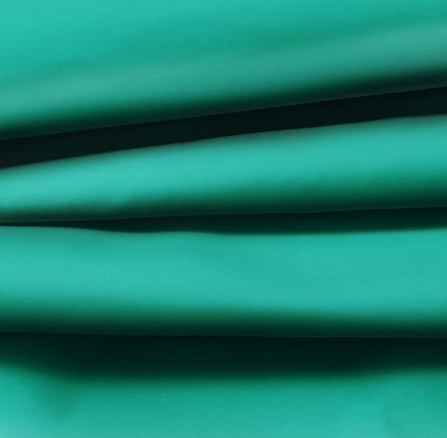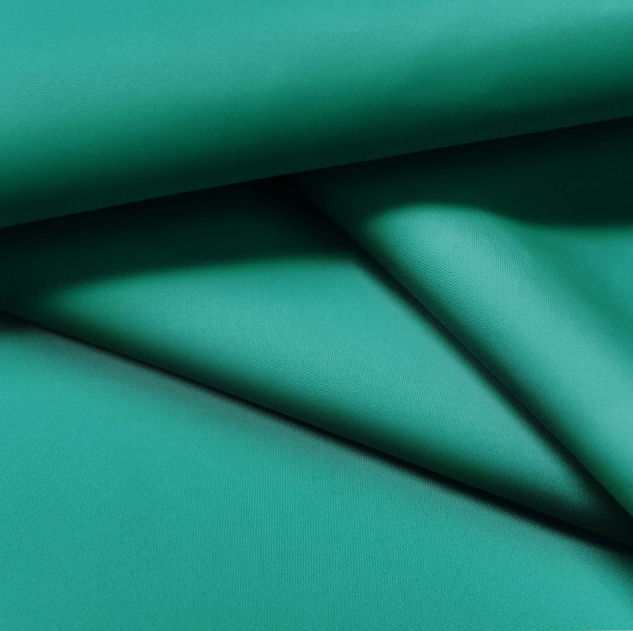 La tela base es la Tela Fina Repelente al Agua - Storm, un tejido técnico de composición 100% poliéster, con un gramaje de 70 gr/m2 y un ancho de 145 cm. El color liso impreso es un tono de verde menta oscuro, representado por un CMYK de 83 21 60 5 y tintas de cian, magenta, amarillo y negro. Este color evoca la frescura y tranquilidad de la naturaleza, con una tonalidad suave pero impactante. Combina especialmente bien con tonos marrones, beige y blanco.