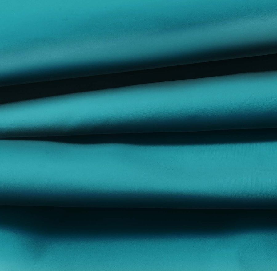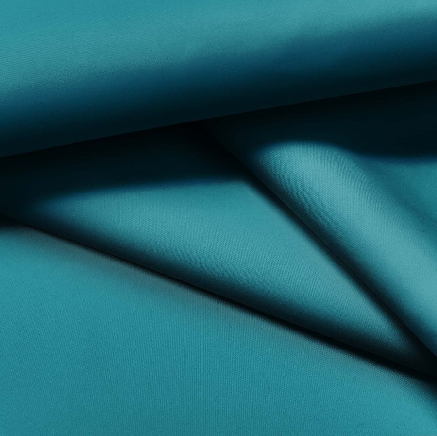 La tela base es la Tela fina repelente al Agua - Storm, compuesta por 100% poliéster con un gramaje de 70 gr/m2 y un ancho de 145 cm. El color liso impreso en la tela es un azul verdoso, con un CMYK de 87 38 40 23. Este color refleja la frescura y calma del agua, mientras que el toque de verde le da un toque de naturaleza y vitalidad. Combina bien con tonos neutros como el blanco y el gris claro, así como con tonos tierra como el marrón y el beige.