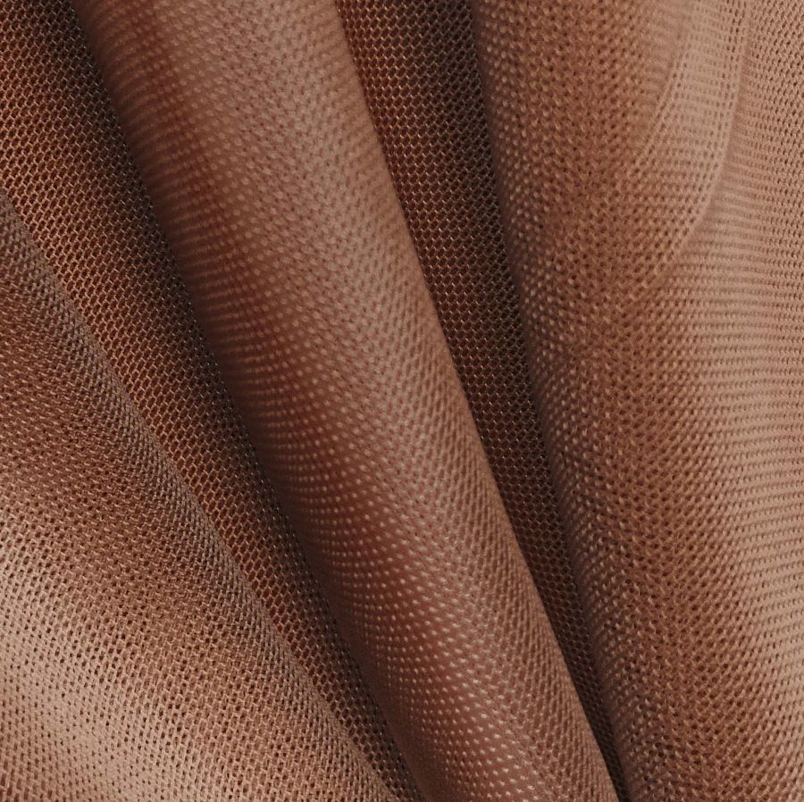 El Tul Elástico - Oslo es una tela translúcida y elástica, compuesta de 94% poliéster y 6% elastano, con un gramaje de 80 gr/m2 y un ancho de 147 cm. Su color liso impreso, Marron Panaderos Marrón, está compuesto por la siguiente combinación de tintas: Cyan 36, Magenta 72, Yellow 82 y Black 51, con un CMYK de 36 72 82 51. El color secundario de este tejido es un cálido marrón con ciertos matices rojizos, lo que hace que parezca un color panadería, ideal para cualquier prenda de vestir o lencería. Este color combina perfectamente con otros tonos marrones, beige y negro.
