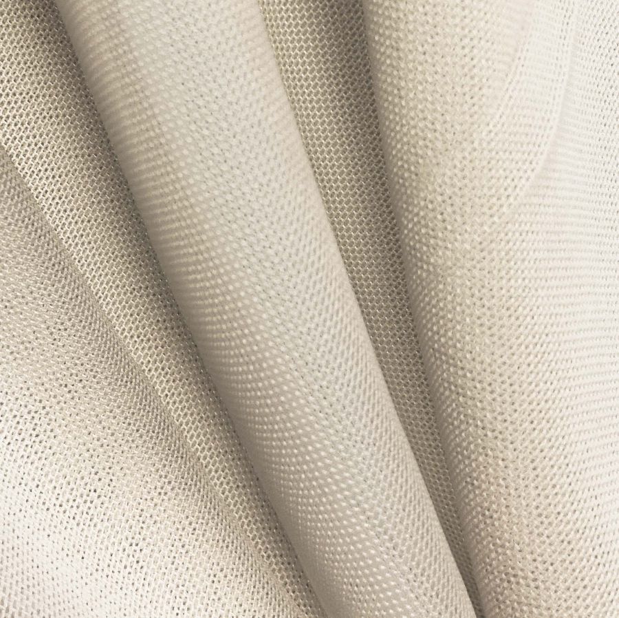 La tela base del tejido es el Tul Elástico - Oslo, compuesto por 94% poliéster y 6% elastano. Su peso es de 80 gr/m2 y su ancho es de 147 cm. En cuanto al color liso impreso, encontramos una combinación de Crudo y Almendra Blanqueada con un contenido de tintas de 5 en Cyan, 12 en Magenta y 24 en Yellow, y un 0 en Black para un total de CMYK: 5 12 24 0.