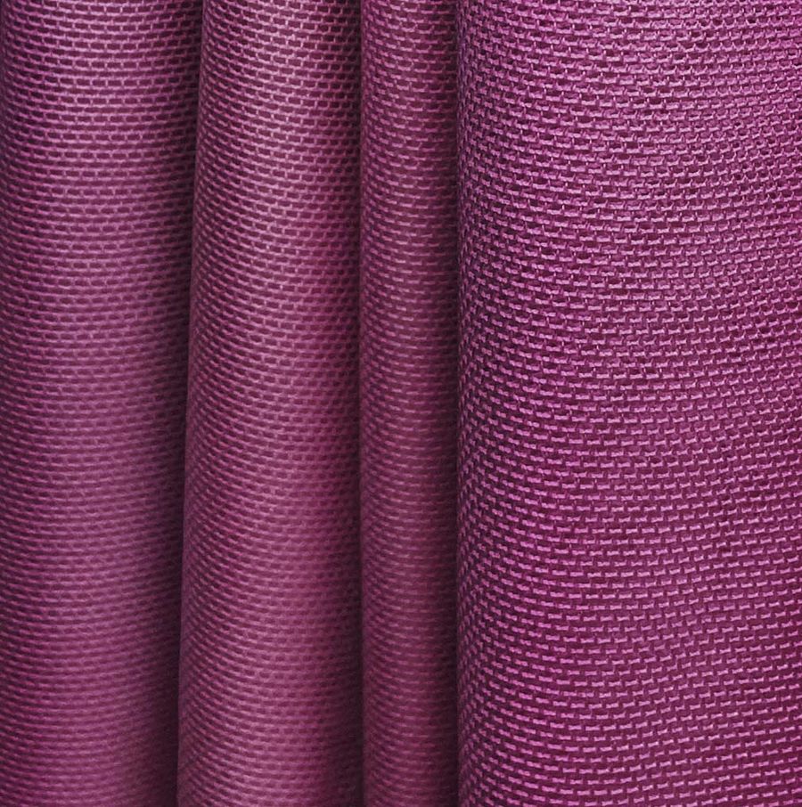 La tela base de este tejido es el Tul Elástico - Oslo, compuesta por un 94% de poliéster y un 6% de elastano, y presenta un gramaje de 80 gr/m2 y un ancho de 147 cm. El color liso impreso es de un tono Morado Berenjena, con valores CMYK de 49 100 31 47. Este color evoca la elegancia y la sofisticación, y es capaz de transmitir emotividad, creatividad y originalidad. El color secundario de la tela también tiene ciertas connotaciones, puesto que el Berenjena es un color muy equilibrado que aporta paz, serenidad y ensalza la creatividad.
