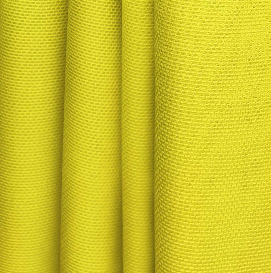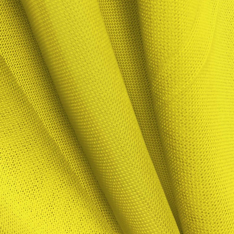 El Tul Elástico - Oslo es un tul transparente y delgado, compuesto por un 94% de poliéster y un 6% de elastano, lo cual le otorga un alto grado de elasticidad, con un gramaje de 80gr/m2 y un ancho de 147cm. El color liso impreso es un brillante Amarillo Canario que resulta de la mezcla de tintas de cian, magenta y amarillo en diferentes proporciones, con un valor de CMYK de 11 9 90 0. Este color secundario evoca alegría y luminosidad, y en combinación con otros colores primarios como el rojo y el azul, se pueden obtener armonías cromáticas muy interesantes.