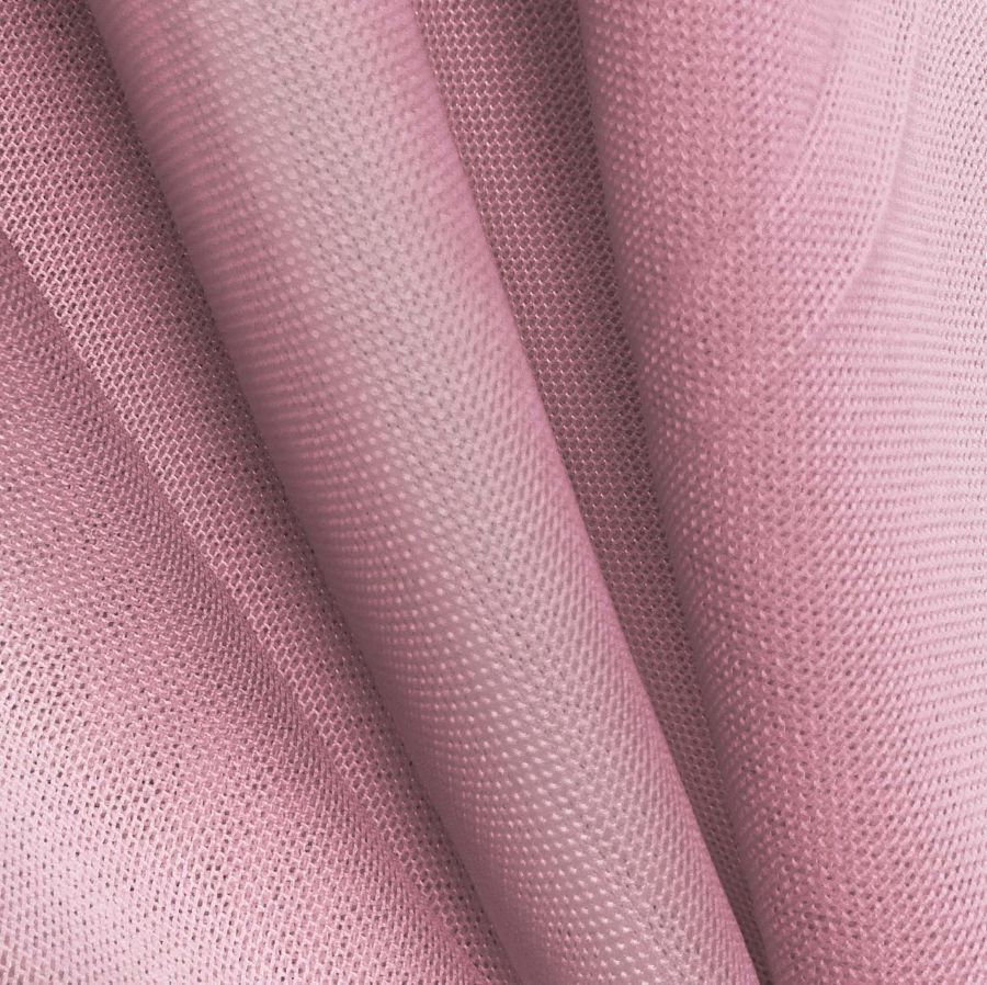 La tela base Tul Elástico - Oslo es un tul transparente y elástico compuesto de 94% poliéster y 6% elastano, que le brinda un tacto delgado y elástico, con un gramaje de 80 gr/m2 y un ancho de 147 cm. El color liso impreso en la tela es una mezcla de rosa, pintalabios rosa y rosa púrpura, con un CMYK de 15 51 20 1, proporcionando una tonalidad suave y femenina.