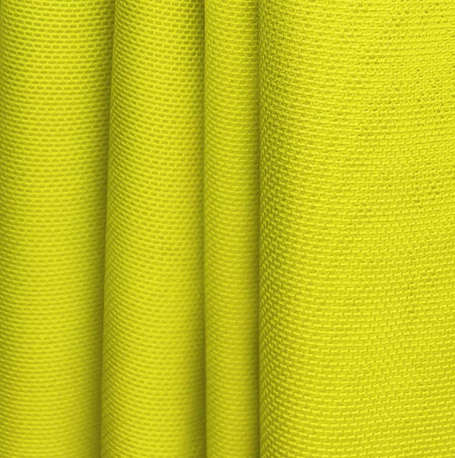 La tela base, un Tul Elástico - Oslo, tiene una composición de 94% poliéster y 6% elastano, un gramaje de 80 gr/m2 y un ancho de 147cm. El color liso impreso es verde camaleón con una tinta Cyan del 23, Magenta del 4, Yellow del 94 y Black del 0, por lo que presenta un alto porcentaje de amarillo. Este color transmite una sensación de frescura y vitalidad, y combina bien con tonos tierra y dorados. El tejido está impreso con este color liso a una sola cara mediante impresión digital textil.