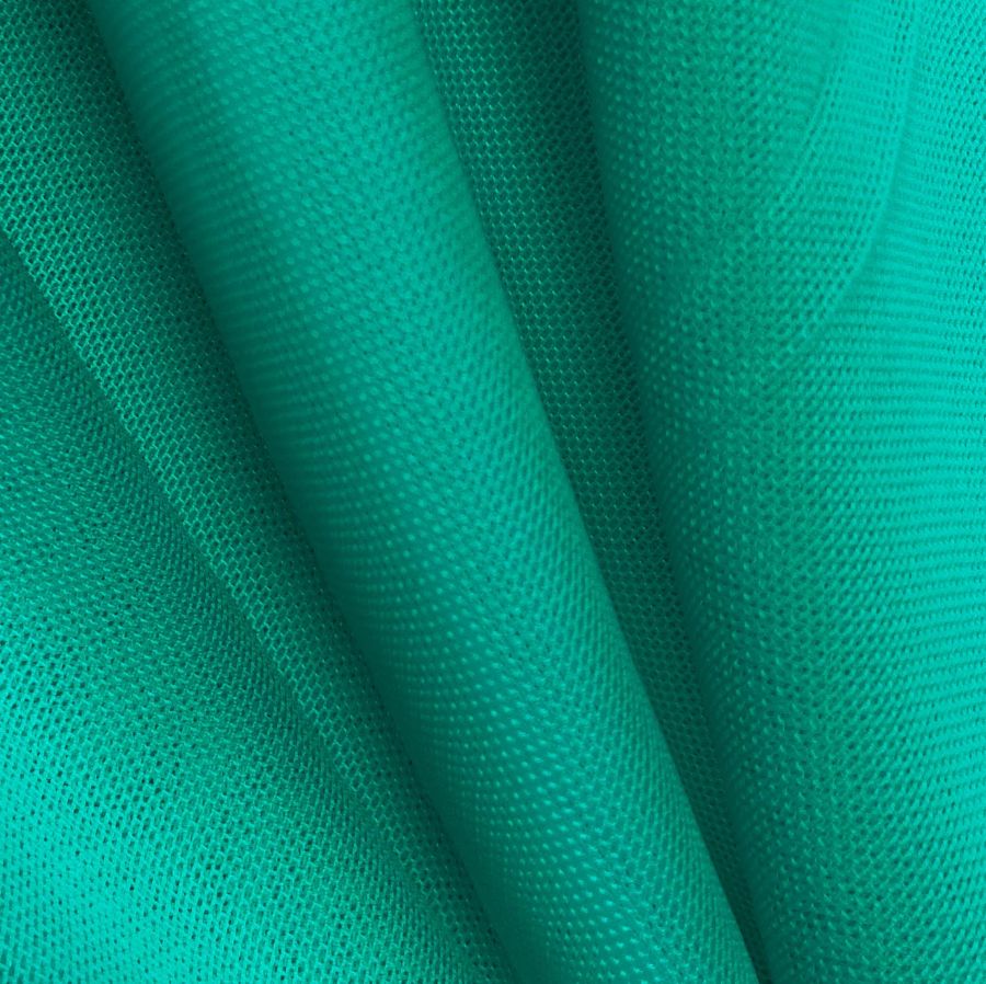 El Tul Elástico - Oslo es una tela de tul suave y elástica, compuesta por un 94% de poliéster y un 6% de elastano. Su gramaje es de 80 gr/m2 y cuenta con un ancho de 147 cm. El color liso impreso en la tela es un vibrante verde menta oscuro, cuyos valores de CMYK son 82 18 58 3. Este color simboliza la frescura, la calma y la serenidad.