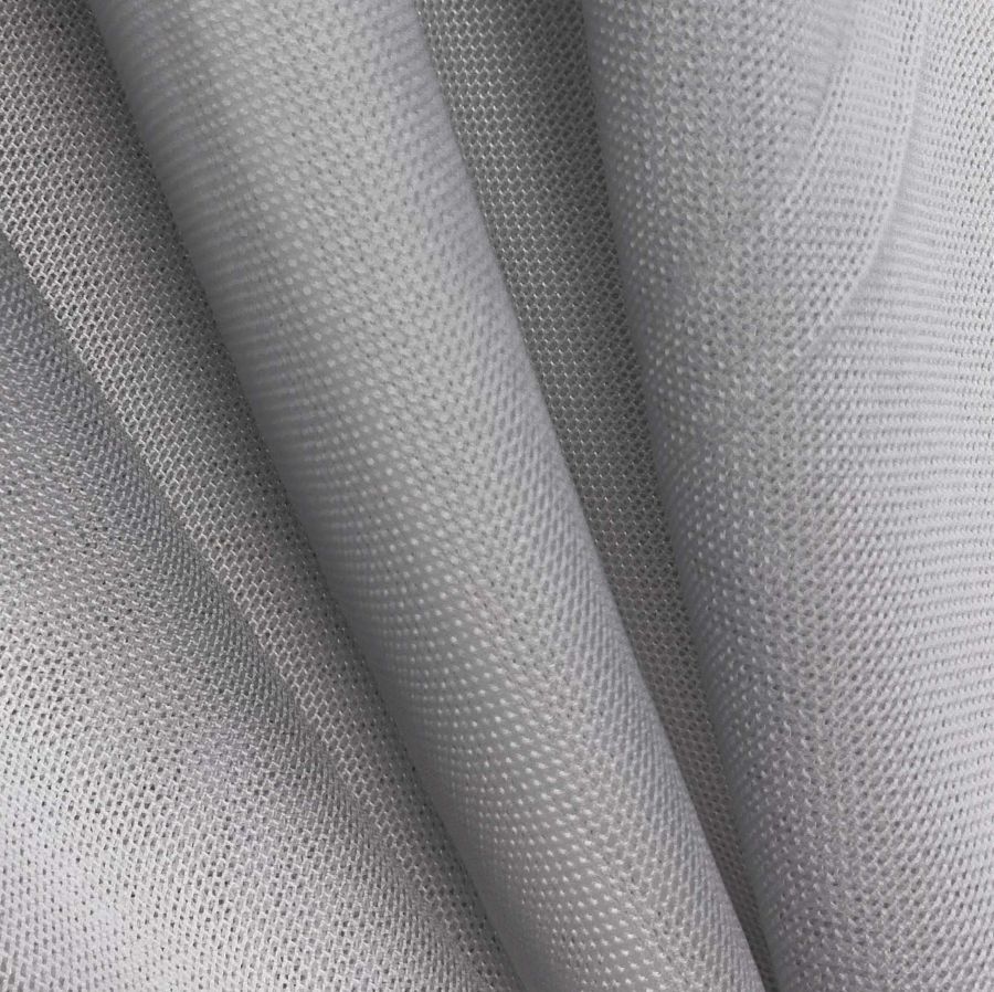 La tela base es el Tul Elástico - Oslo, compuesto en un 94% de poliéster y un 6% de elastano, con un peso de 80 gr/m2 y un ancho de 147 cm. El color liso impreso es Gris,Plata sónica, con un CMYK de 42 33 30 9. El color secundario es un gris claro y brillante que combina perfectamente con tonos azulados, desde un azul petróleo intenso hasta un celeste más pálido.