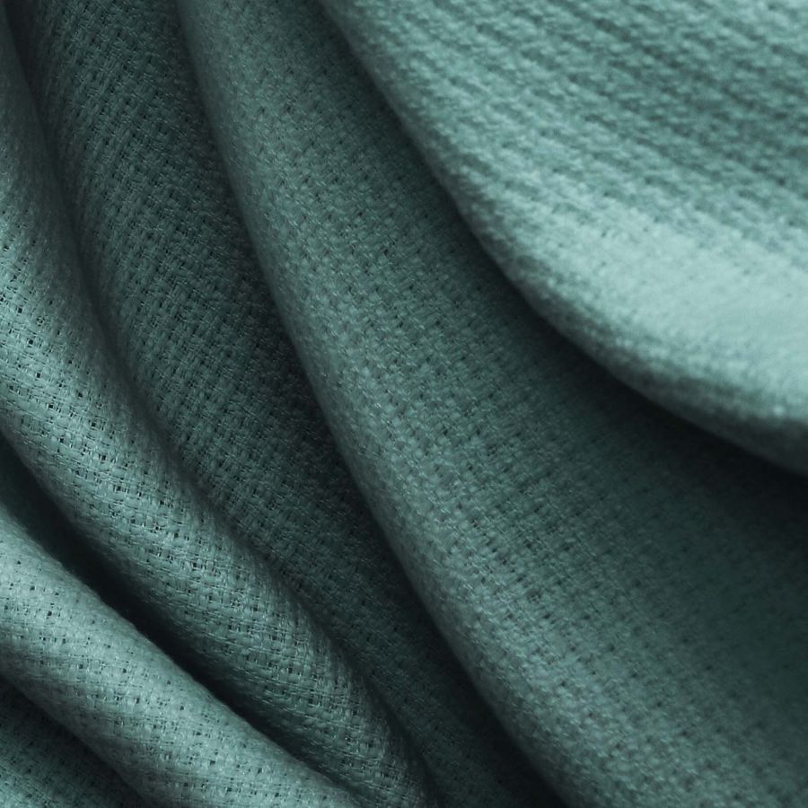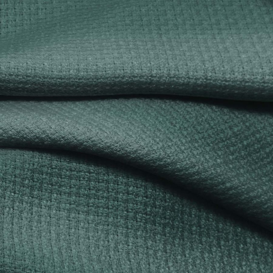 La tela base es Tweed - Chanel, 100% POLIÉSTER, con una densidad de 420 gr/m2 y ancho de 150 cm. El color liso impreso es Azul Teal profundo, con una intensidad de 74 en cyan, 45 en magenta, 54 en amarillo y 42 en negro, según el CMYK. Simbólicamente, este color evoca la serenidad y la confianza, transmitiendo un ambiente elegante y sofisticado. Su tonalidad combina especialmente bien con tonos tierra y beige.