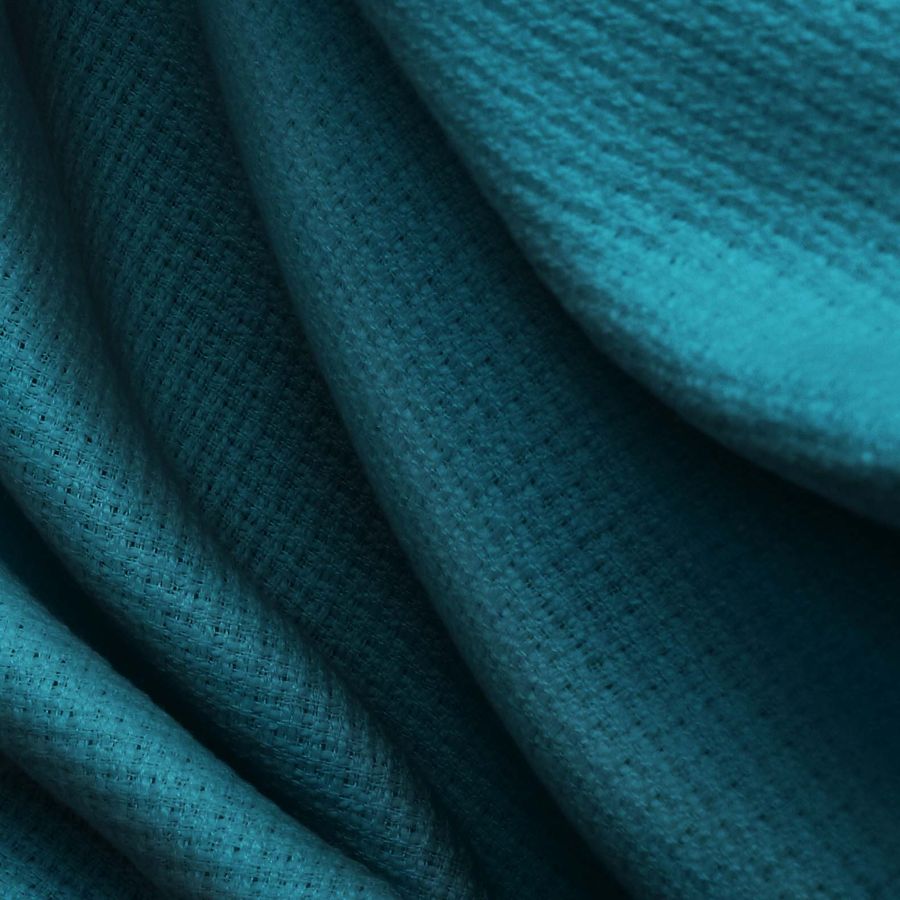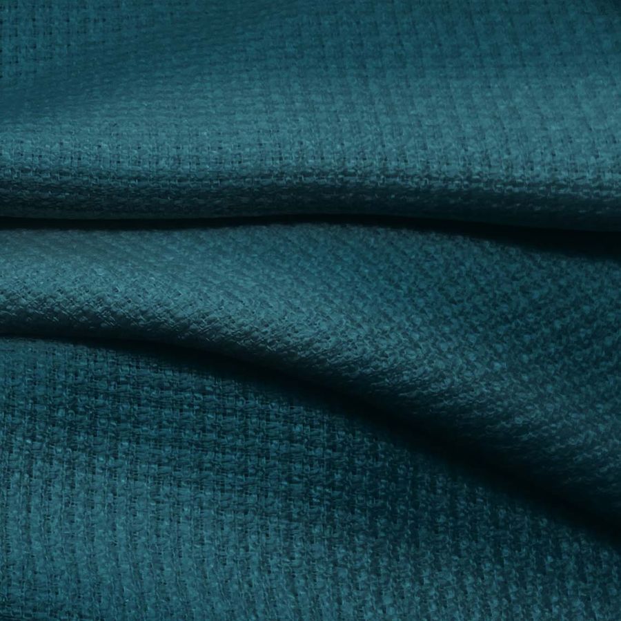 La tela base es el Tweed - Chanel, compuesta al 100% de poliéster, con un gramaje de 420 gr/m2 y un ancho de 150 cm. Su color liso impreso es un verde teal profundo, con un CMYK de 96 58 50 50. Este color es simbólicamente fresco, tranquilo y sofisticado, mientras técnica y visualmente es un tono con alta intensidad cromática y un matiz entre el verde y el azul. Combina especialmente bien con tonos neutros como el beige, marrón y gris, así como con colores cálidos como el amarillo o el rojo.