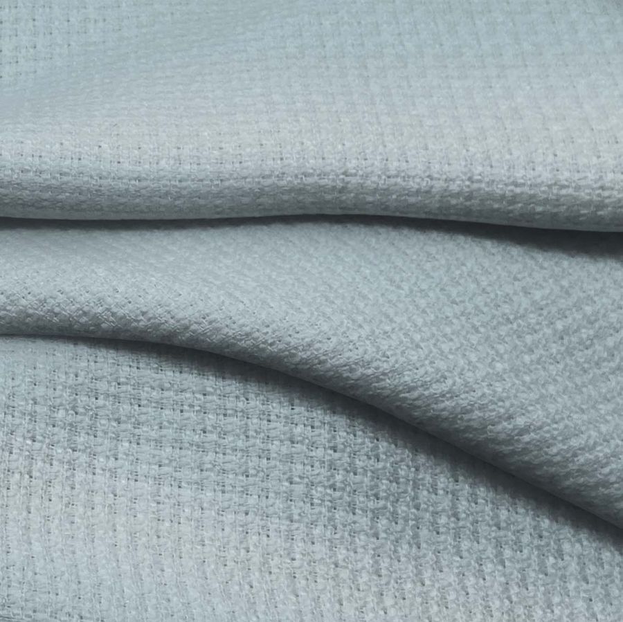 La tela base es el Tweed - Chanel, una tela de tweed de 100% poliéster de 420 gramos por metro cuadrado, con un ancho de 150 cm. El color liso impreso es un tono de azul claro, con un CMYK de 37 16 20 1, que se combina especialmente bien con tonos neutros como el gris o el beige. Es importante destacar que el tejido está impreso con el color liso a una sola cara por impresión digital textil y no es un tejido tintado, lo que aporta una gran viveza y precisión al color.