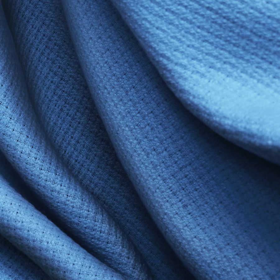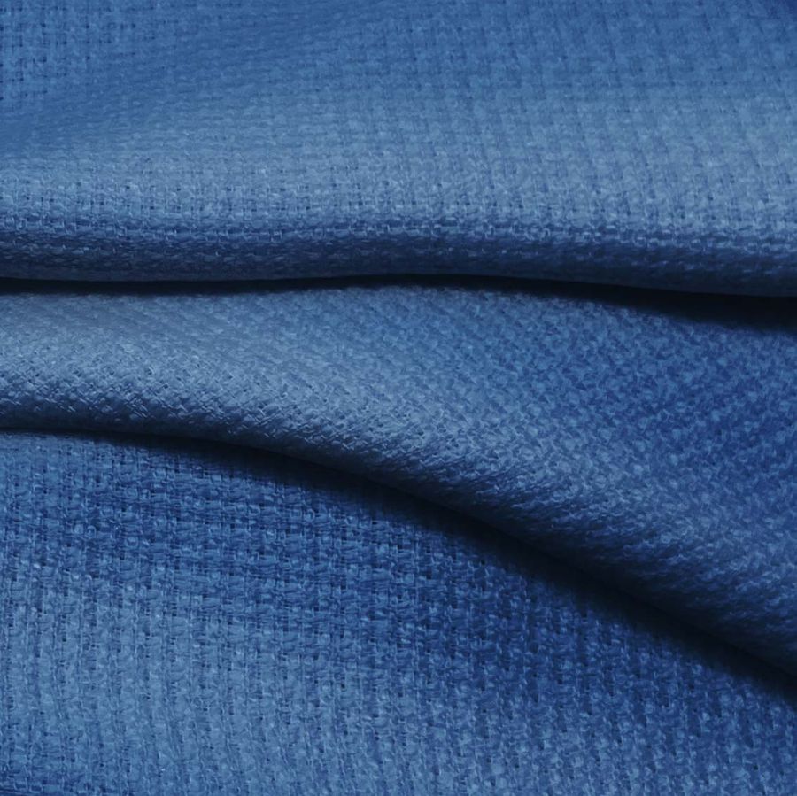 La tela base es Tweed - Chanel, un tejido tweed de 100% poliéster de 420 gr/m2, con un ancho de 150 cm. El color liso impreso es Azul Arrendajo, con un CMYK de 89-65-25-9, lo que se traduce en un tono alegre, refrescante y vibrante. Este color encaja perfectamente con tonos neutros como el blanco, gris y negro, pero también con tonos tierra y marrones.