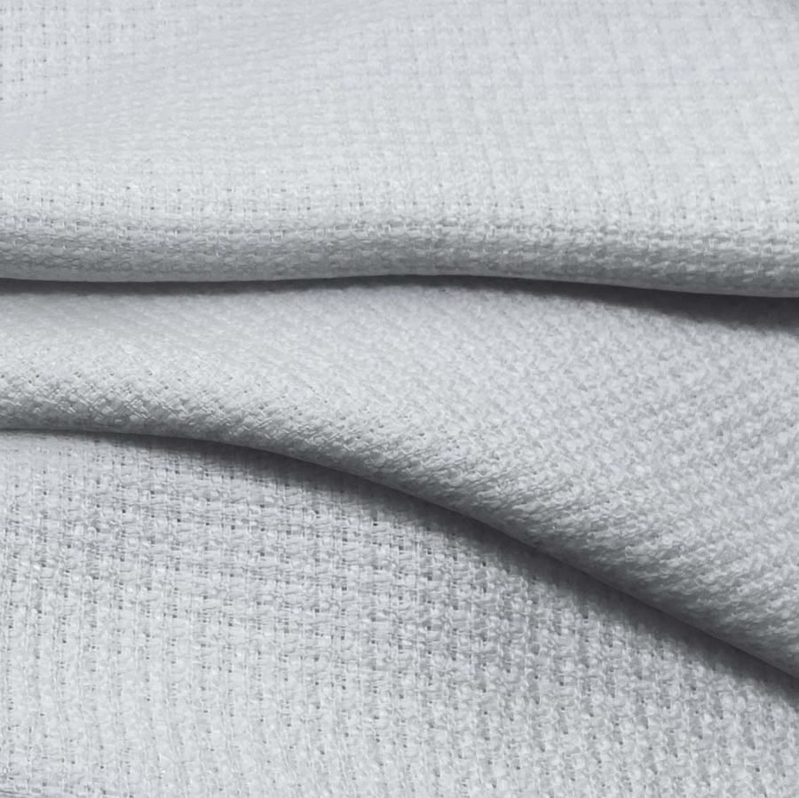 La tela base es un tweed de Chanel de composición 100% poliéster, con un gramaje de 420 gr/m2 y un ancho de 150 cm. El color liso impreso en esta tela es un vibrante azul agua, con una combinación de tinta Cyan (14), Magenta (7) y Yellow (6) y un CMYK de 14, 7, 6, 0. Este color evoca la tranquilidad del mar y la paz de la naturaleza, y combina perfectamente con tonos neutros y cálidos como el blanco, beige y marrón.