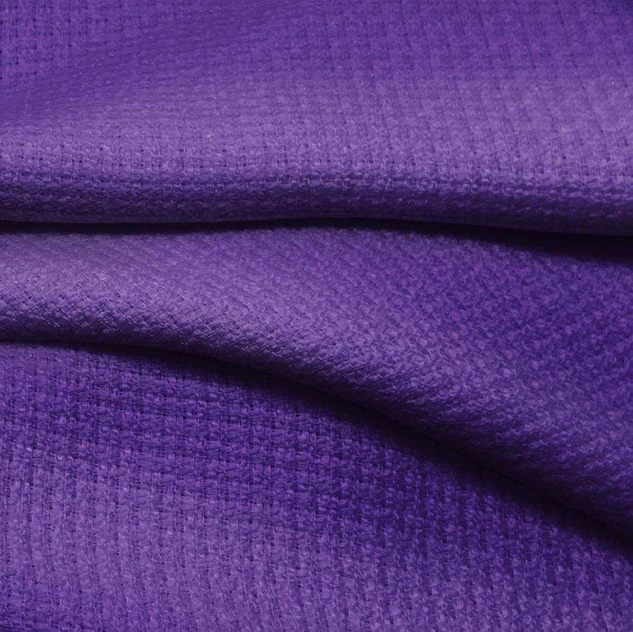 La tela base es Tweed - Chanel, una tela de poliéster con un gramaje de 420 gr/m2 y un ancho de 150 cm. El color liso impreso en esta tela es morado iris, con una tinta cyan de 84, magenta de 95, yellow de 10 y black de 2. Este color refleja la profundidad y la intensidad del iris, con un tono rico y vibrante que no pasa desapercibido. El morado iris combina particularmente bien con colores como el blanco, el gris y el rosa suave, ya que los resalta aún más.