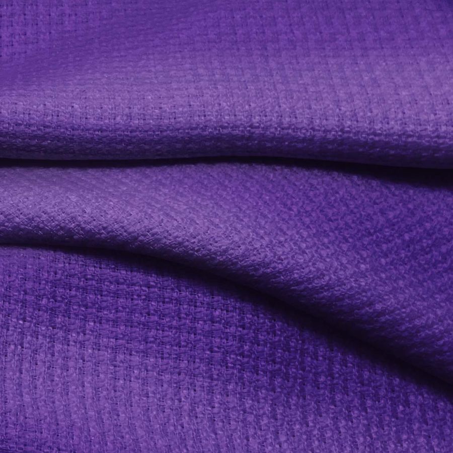 El Tweed Chanel es una tela de tipo tweed con una composición de 100% poliéster que tiene un gramaje de 420 gr/m2 y un ancho de 150 cm. Su color liso impreso es de tonalidades morado e índigo con un CMYK de 85 96 4 0. Este color es simbólicamente asociado con la nobleza y la creatividad. Técnicamente, su tonalidad es oscura y vibrante que se combina armoniosamente con tonos marrones y grises.