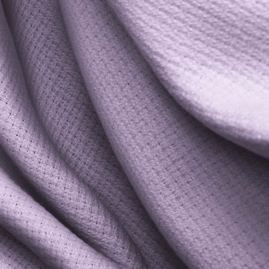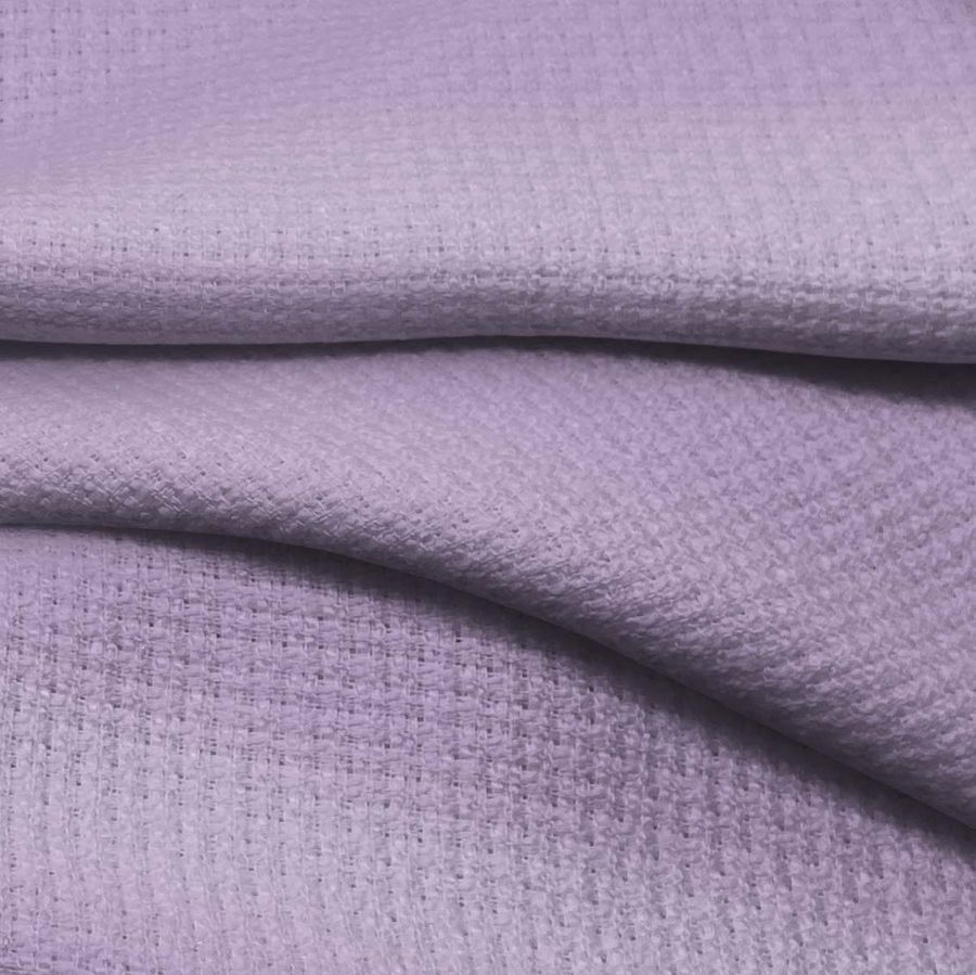 La tela base Tweed-Chanel es una tela de tweed compuesta por 100% poliéster y con un gramaje de 420 gr/m2, con un ancho de 150 cm. El color liso impreso en esta tela es un hermoso morado con flores purpuras, y su CMYK es de 33 40 5 0. Este color secundario es simbólico de la creatividad, la sabiduría y la ambición, y se puede combinar muy bien con otros colores como el gris, el rosa claro y el amarillo. Es importante señalar que el tejido está impreso con el color liso a una sola cara por impresión digital textil.