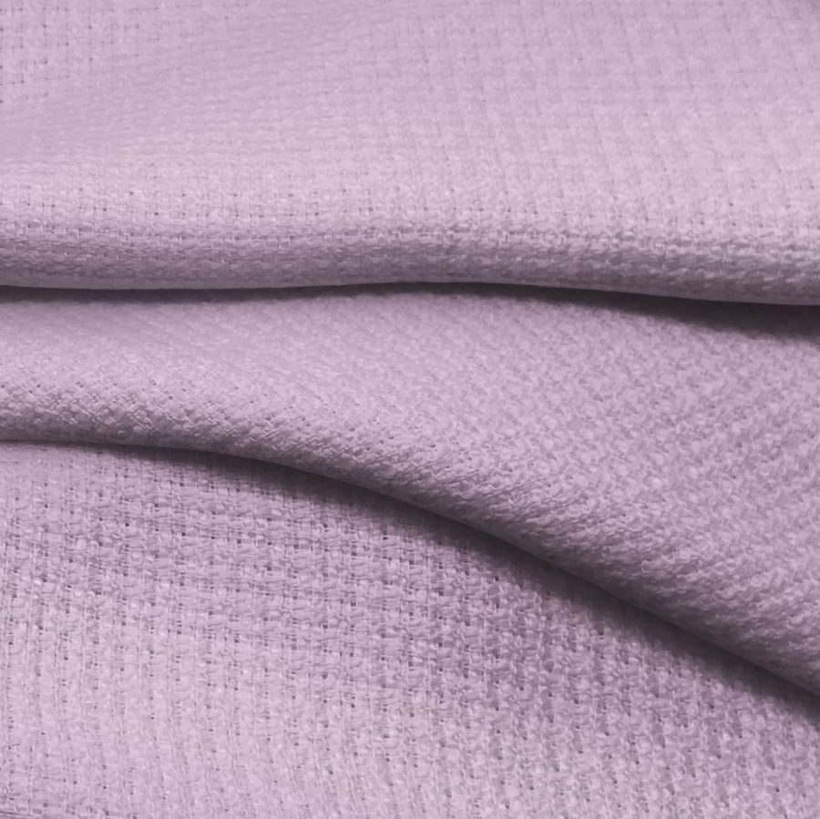 La tela base es un Tweed Chanel compuesto por 100% poliéster con un gramaje de 420 gr/m2 y una anchura de 150 cm. Se trata de una tela rígida al tacto siendo ideal para chaquetas, blazers, abrigos, faldas, vestidos, cazadoras, chalecos, shorts y hasta accesorios como pajaritas o gorros. El color liso impreso en la tela es morado, más precisamente un cardo morado con un CMYK de 16 35 4 0, lo que proporciona un color vibrante y duradero sobre la superficie. Este color simboliza creatividad, elegancia y sofisticación. Combina muy bien con tonos oscuros como el negro, el marrón y el gris, y también se puede complementar con colores más claros como el rosa, el blanco y el beige.
