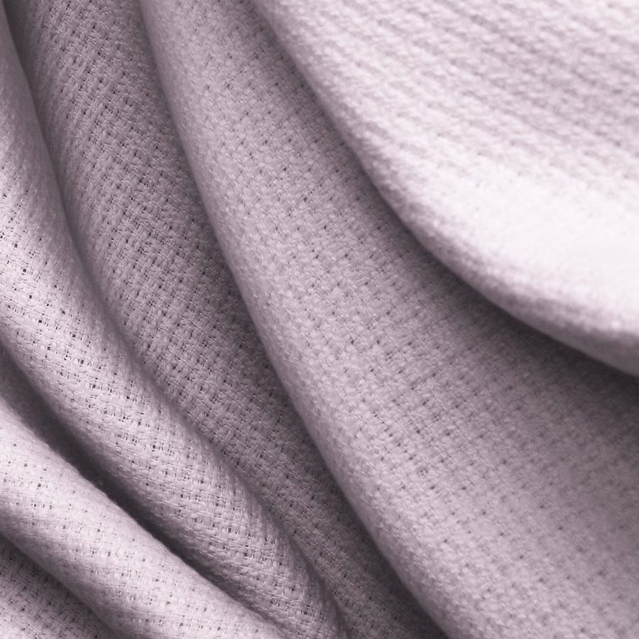La tela base es el Tweed-Chanel, compuesta por 100% poliéster, con un peso de 420 gramos por metro cuadrado y un ancho de 150 cm. El color liso impreso es rosa cerdo, con un CMYK de 8 24 3 0. Este color tiene un tono suave y delicado, transmitiendo calma y tranquilidad. Además, su tonalidad evoca la frescura de la primavera.