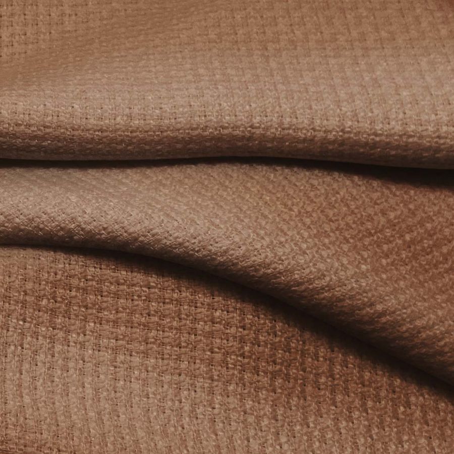 La tweed Chanel es una tela rígida de 420 gr/m2 y 150 cm de ancho, compuesta al 100% por poliéster, en un tono marrón oso café con un CMYK de 35 55 66 37. Este color se caracteriza por ser cálido y elegante, con un toque de sobriedad y fondos cálidos. Combina bien con tonos grises, ocres, dorados y mostaza. Cabe destacar que este tejido está impreso con un color liso a una sola cara, mediante la técnica de sublimación digital textil.