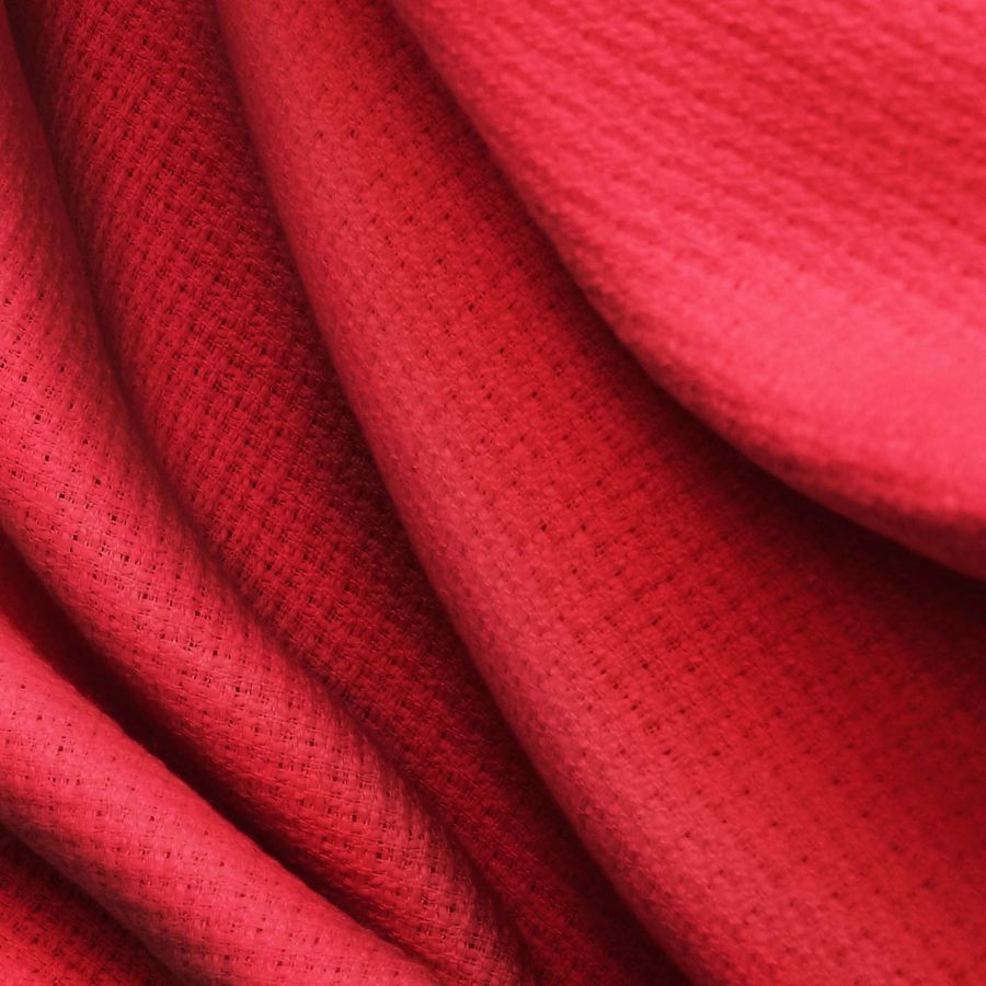 La tela base es un tweed de poliéster con un gramaje de 420 gr/m2 y un ancho de 150 cm. El color liso impreso es un rojo pimiento picante con un CMYK de 17 100 89 7. Este color secundario transmite fuerza, pasión y energía y combina perfectamente con tonalidades neutras como el marrón claro o el beige. La tela está impresa con el color liso a una sola cara mediante impresión digital textil.