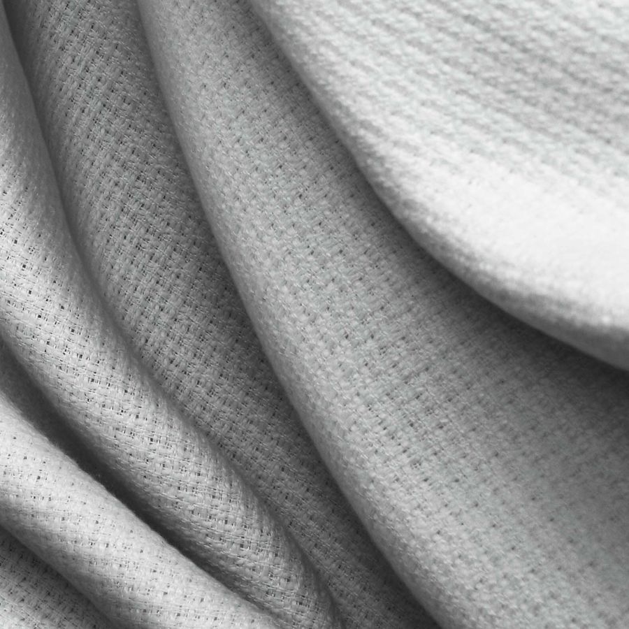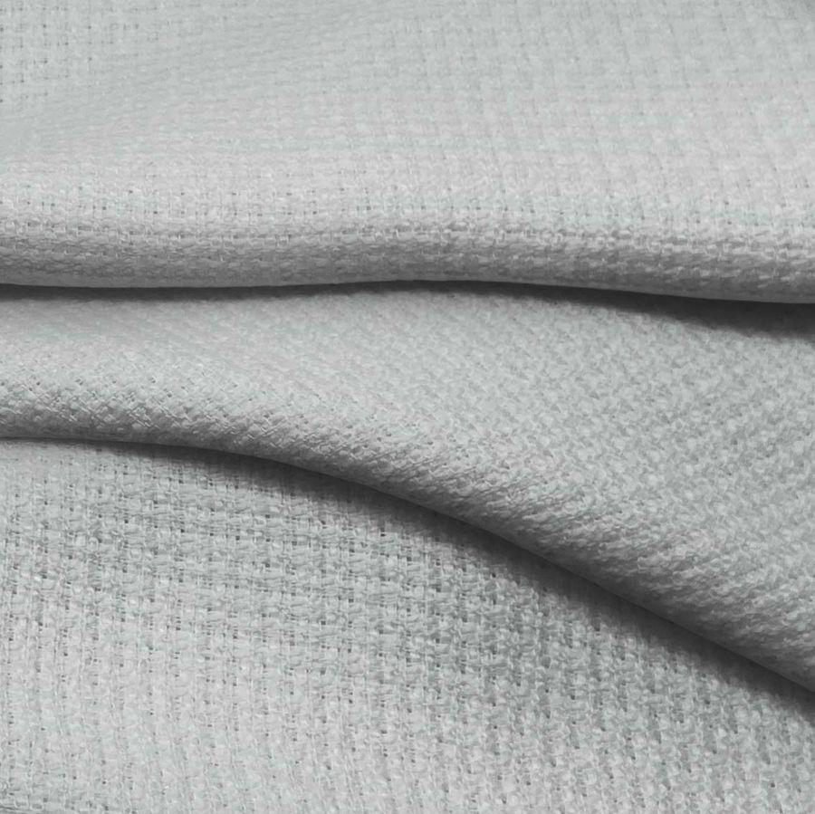 La tela base es el Tweed - Chanel, 100% poliéster, con un gramaje de 420 gr/m2 y un ancho de 150 cm. Su color liso impreso es gris plata, con un CMYK de 25 16 18 1, lo que indica que es un color de tono bajo, cálido y neutro con un toque de brillo.