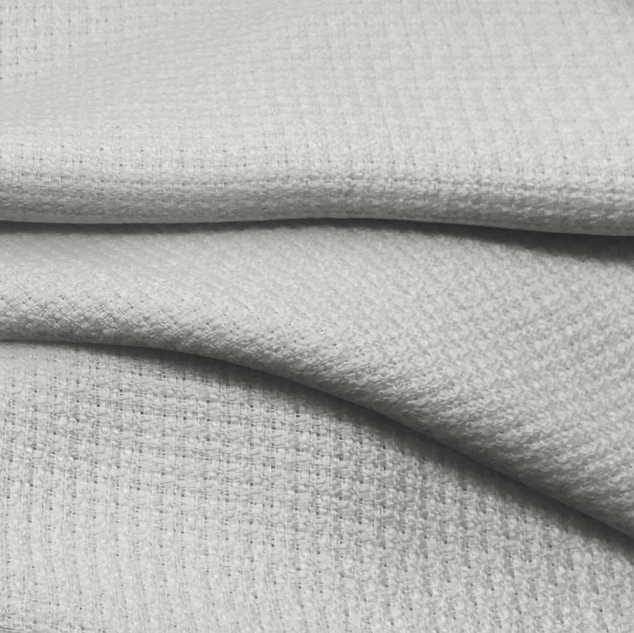 La tela base es el Tweed Chanel, un tejido de tipo Tweed compuesto al 100% de poliéster y con un gramaje de 420 gr/m2. Su ancho es de 150 cm y cuenta con una serie de cuidados que deben ser seguidos al pie de la letra. El color liso impreso es de un hermoso gris plata platino. El CMYK del color liso es de 17 11 15 0 y destaca por su textura rígida.