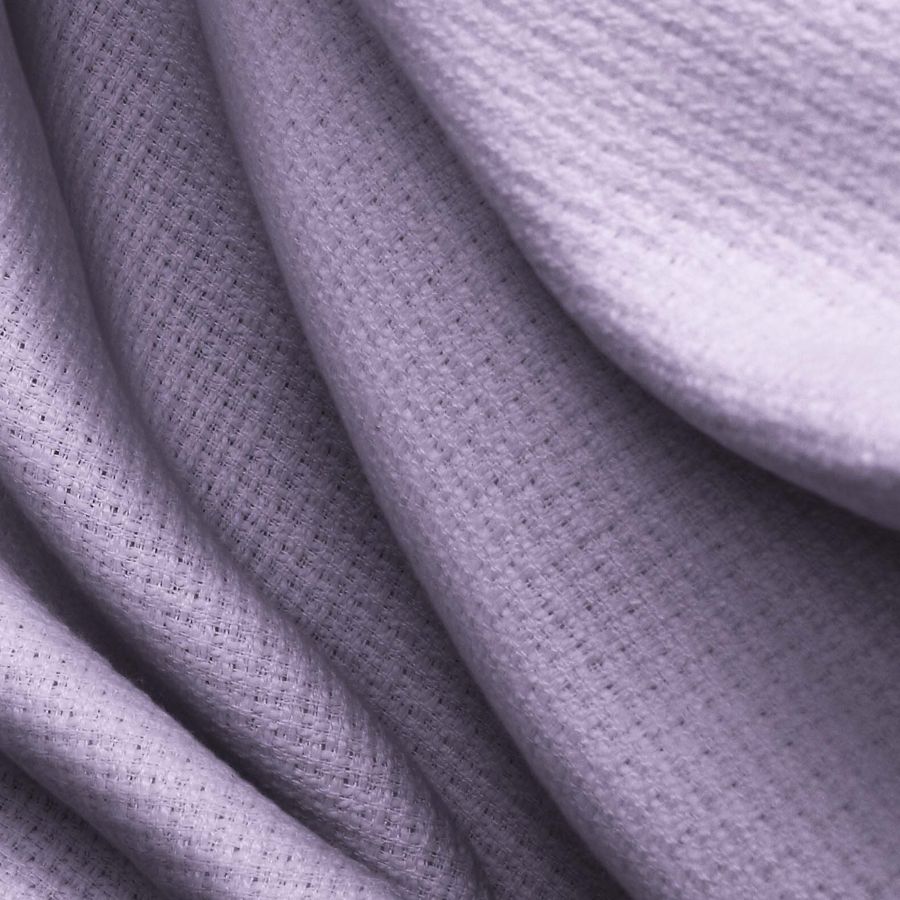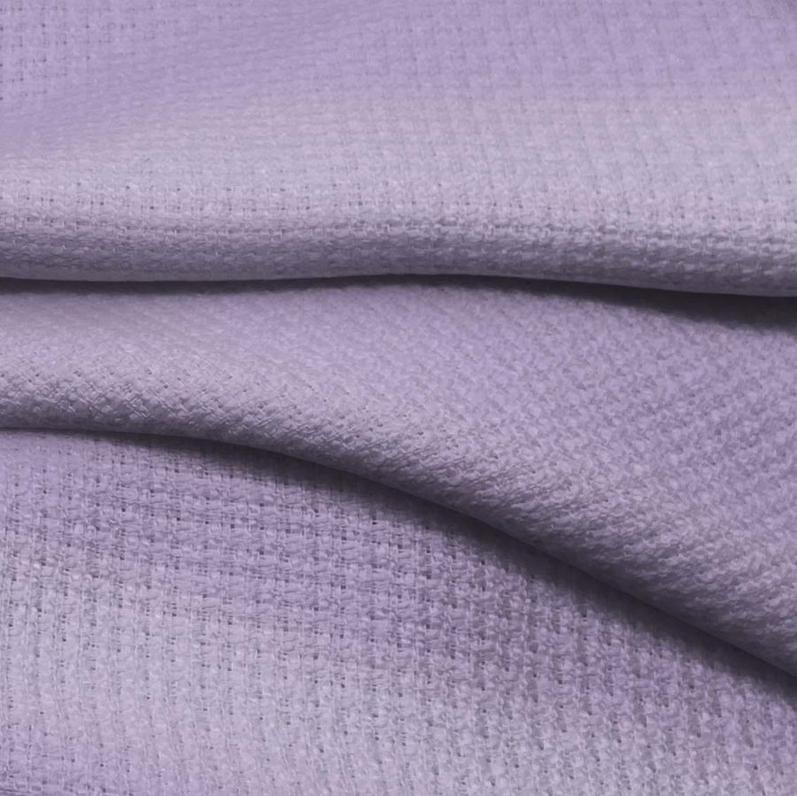 La tela base es un Tweed - Chanel de 100% poliéster, con un gramaje de 420 gr/m2 y un ancho de 150 cm. El color liso impreso es Morado - Púrpura medio, con un CMYK de 35 40 5 0. Este color combina perfectamente con negro, grises claros y oscuros, y tonalidades pastel. La tela está impresa con el color liso a una sola cara por impresión digital textil.