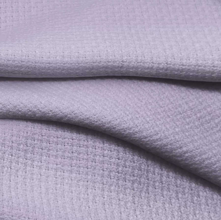 La tela base es un tweed de Chanel 100% poliéster, con un gramaje de 420 gr/m2 y una anchura de 150 cm. Su color liso impreso es un púrpura medio con un CMYK de 27 31 4 0, lo que nos indica que su tonalidad se acerca al magenta con un toque azulado y una intensidad baja. Combinable con blancos y beiges, así como tonos más pastel.