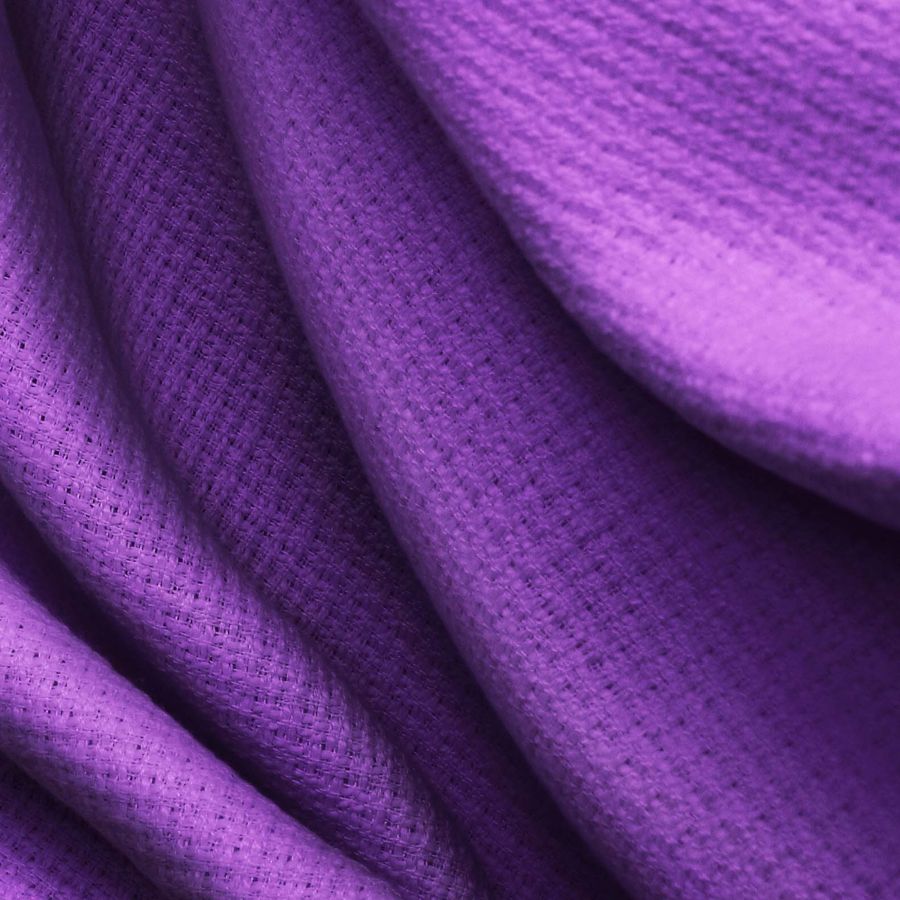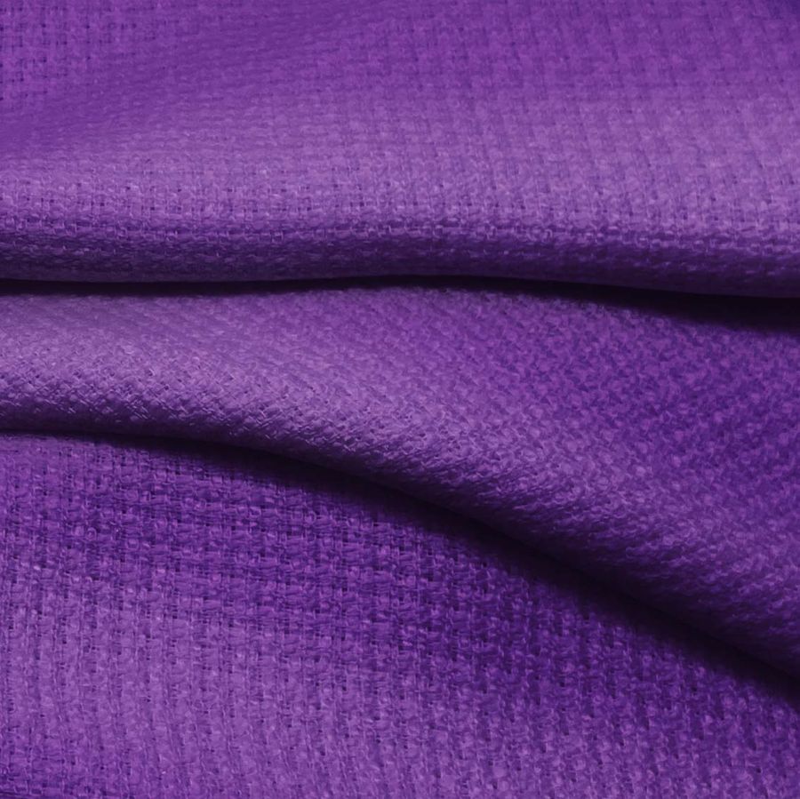 La tela base es el Tweed - Chanel, con una composición de 100% poliéster y un gramaje de 420 gr/m2. El color liso impreso es de tonalidad morado irisado, con un CMYK de 76 95 4 0. Este color presenta una fuerte presencia del magenta y un ligero aporte de amarillo, lo que le da una tonalidad fría y luminosa. Además, su aspecto iridiscente le hace destacar por su brillo y elegancia. Combina especialmente bien con tonalidades de gris y negro, creando un efecto sofisticado en la prenda final.