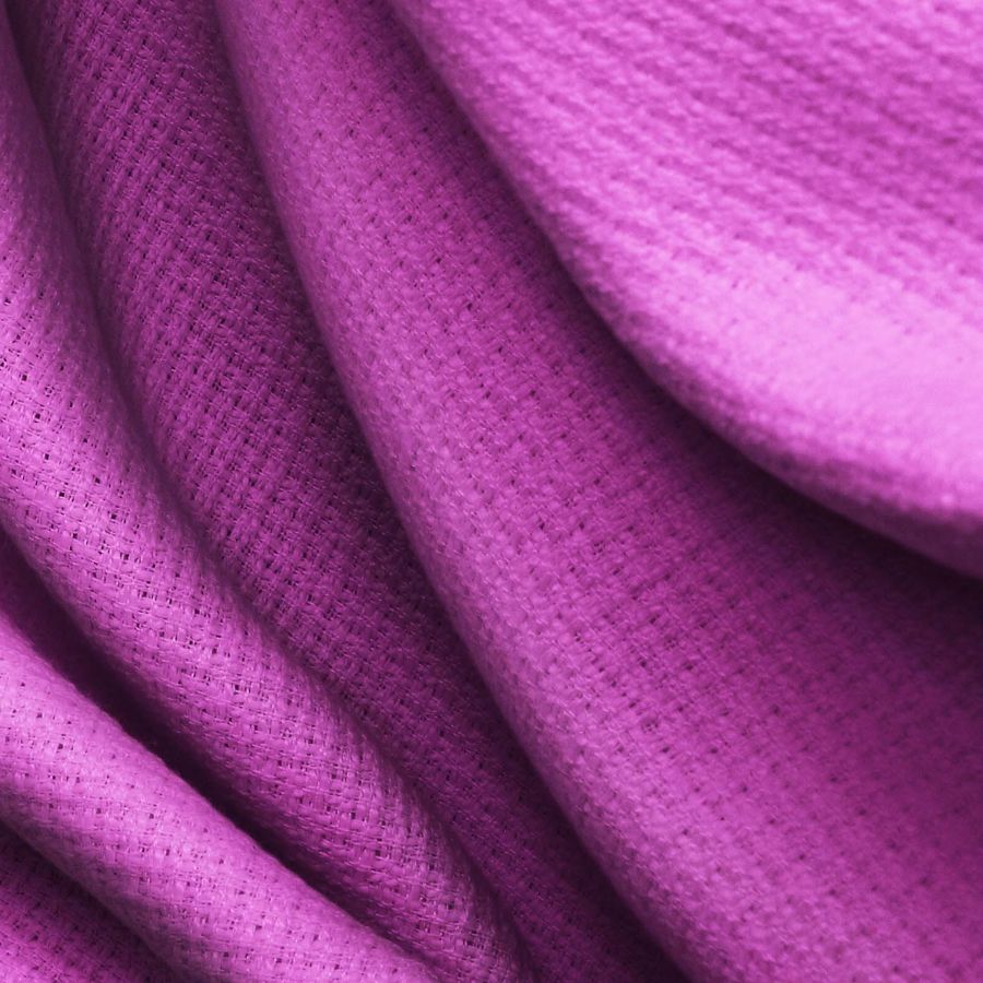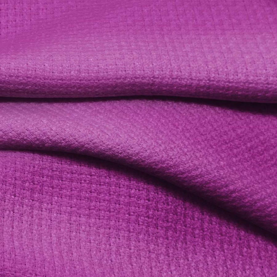 La tela base, Tweed-Chanel, es un tejido grueso de poliéster con un gramaje de 420 gr/m2 y un ancho de 150 cm. El color liso impreso es Morado-DarkMagenta, con una composición CMYK de 46 88 2 0. Este color transmite una sensación de elegancia y sofisticación, con un tono principal que se inclina hacia el rosa oscuro, pero con toques de morado intenso. Es un color que combina especialmente bien con tonos neutros como el blanco, negro y gris, así como con tonos metálicos como dorado y plateado.